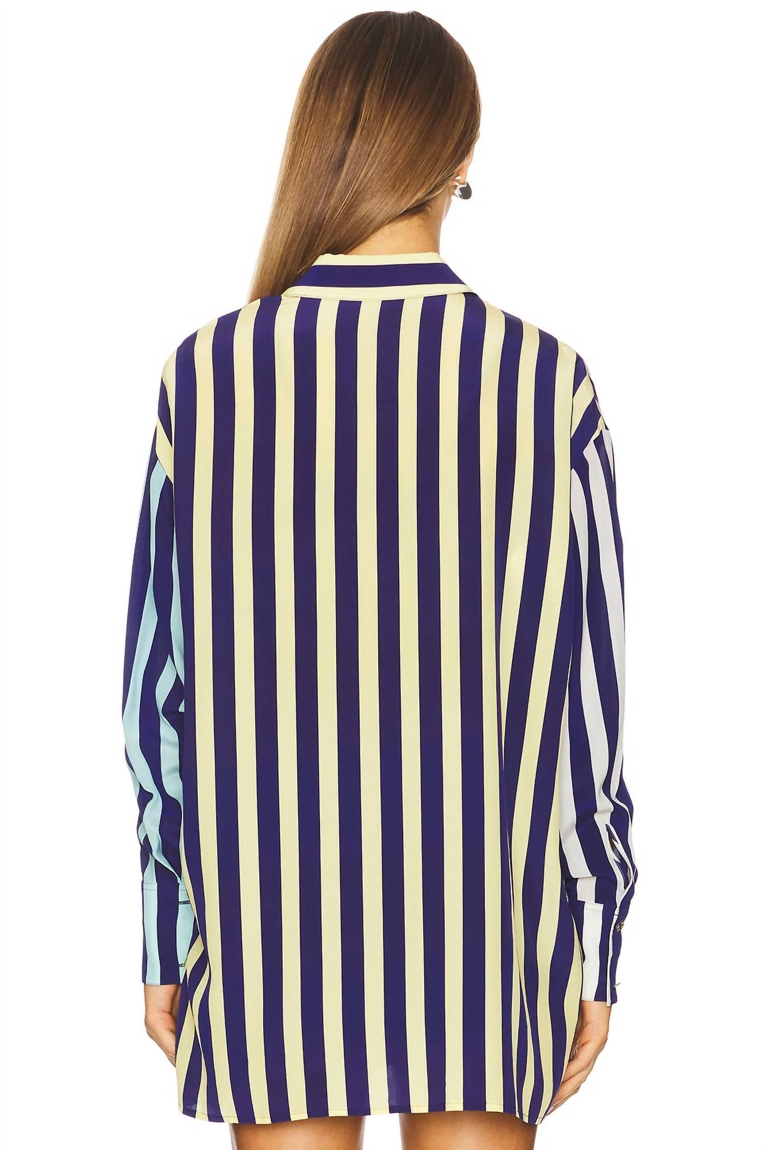 Perfectly tailored and soft to the touch. Elevate your wardrobe with the Striped Oversized Shirt by Muma World, a chic piece perfect for any day. This women's shirt features long sleeves and a classic collar, made from 65% rayon and 35% polyester for a smooth, comfortable fit. It boasts a stylish stripe pattern and is made in China, with a front button closure that includes logo-embellished buttons for a touch of flair. To keep this shirt looking its best, simply hand wash as needed.