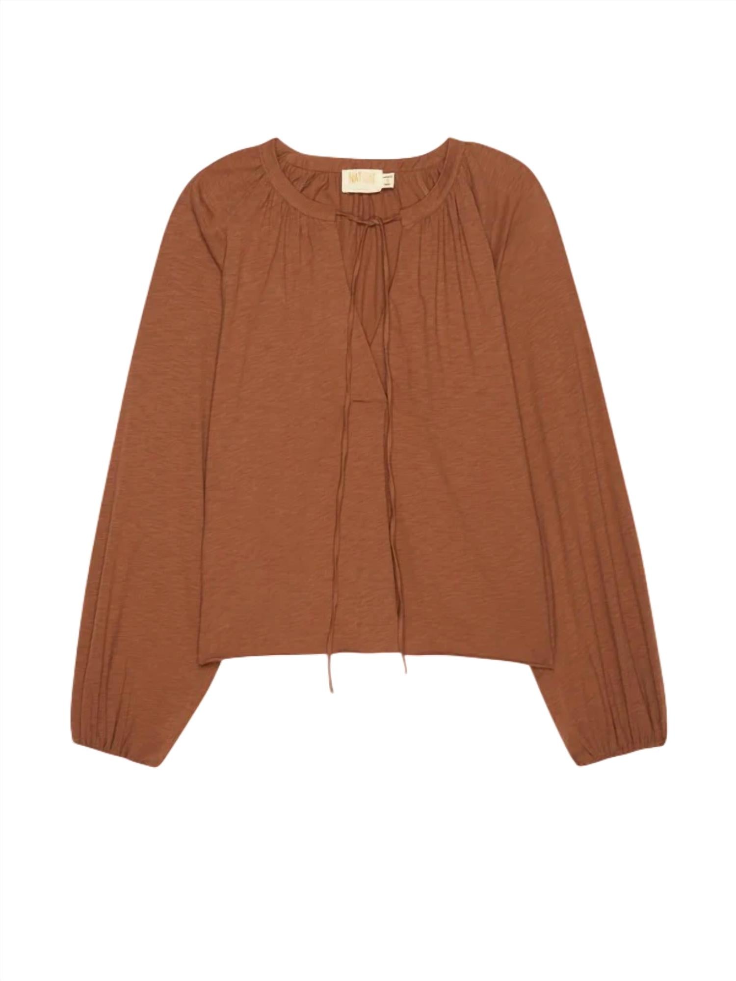 A versatile blouse that works from desk to dinner! Discover the Chiara Long Sleeve Top by Nation LTD, an exquisite piece crafted in tobacco-toned solid color for a minimalist Tuscan vibe. This long-sleeved blouse, with its raglan sleeves and elasticated cuffs, offers an easy fit that feels slightly roomier yet maintains a chic silhouette. Made from 100% soft Pima Cotton, it features a neckband with ties for a touch of elegance. Originating from Peru, it is conveniently machine washable and best air-dried or tumbled on low to maintain its form.