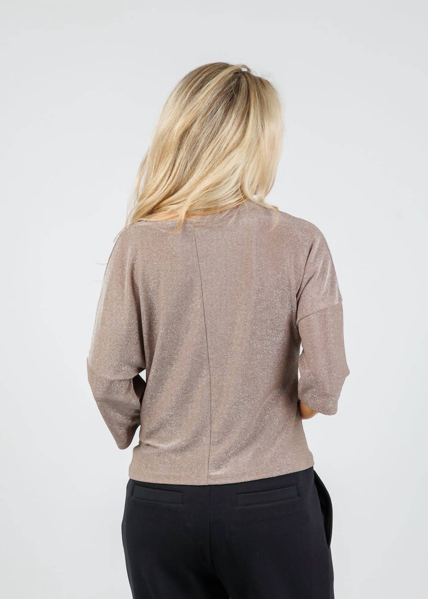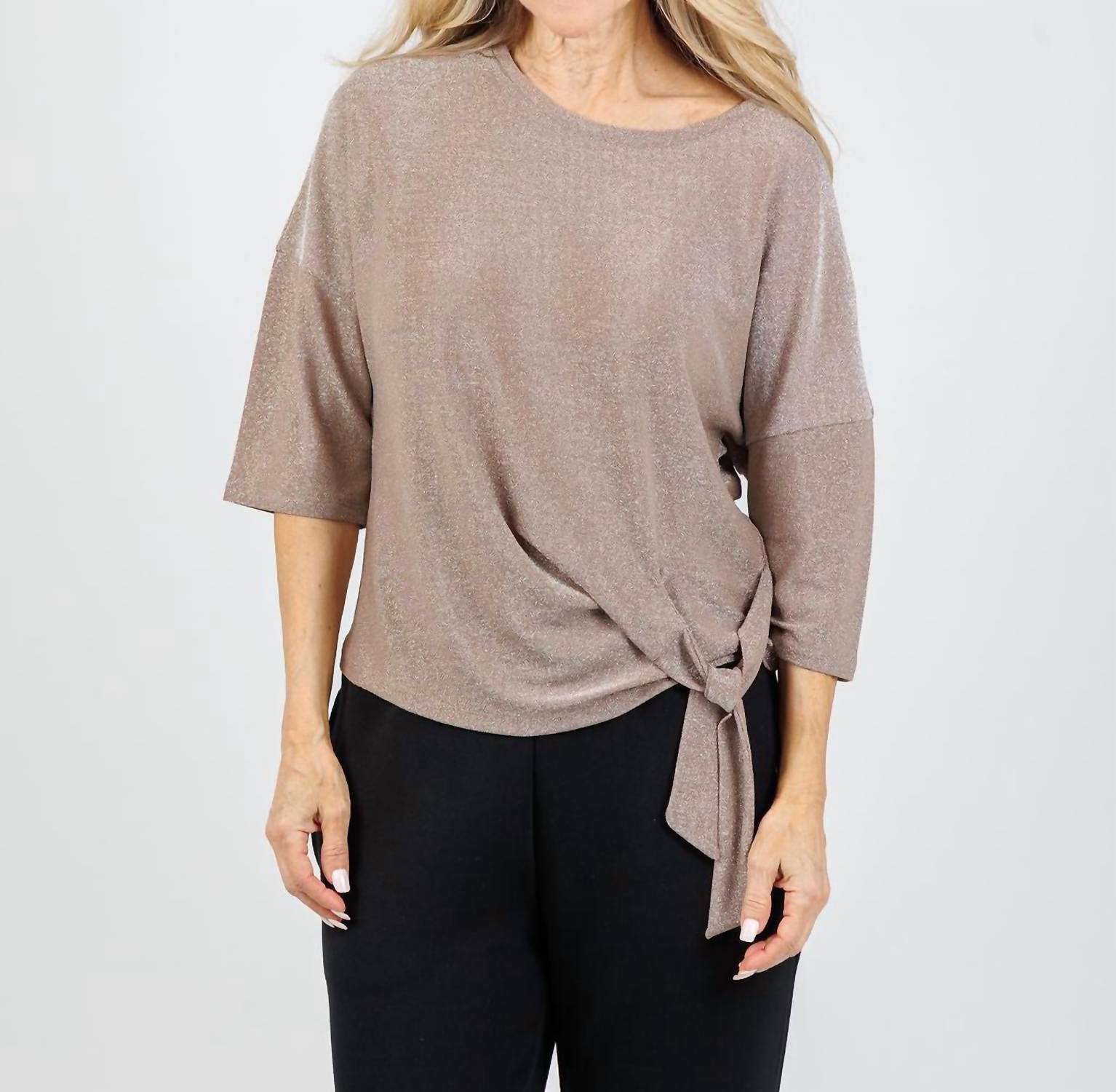 Experience the shimmer and sophistication of the Oui Lurex Tie Top in a warm Salty Caramel hue. Featuring short sleeves, this knit is composed of 60% Polyamide, 35% Metal, and 5% Elastane for a soft shimmer and relaxed fit. It has a crewneck and is designed with a gathered tie detail at the side for a flattering silhouette. Closure: Pull on. Model is wearing a size 4 (Karen is 5'6" tall, 34" bust, 25" waist, 34" hip, 28" inseam).
