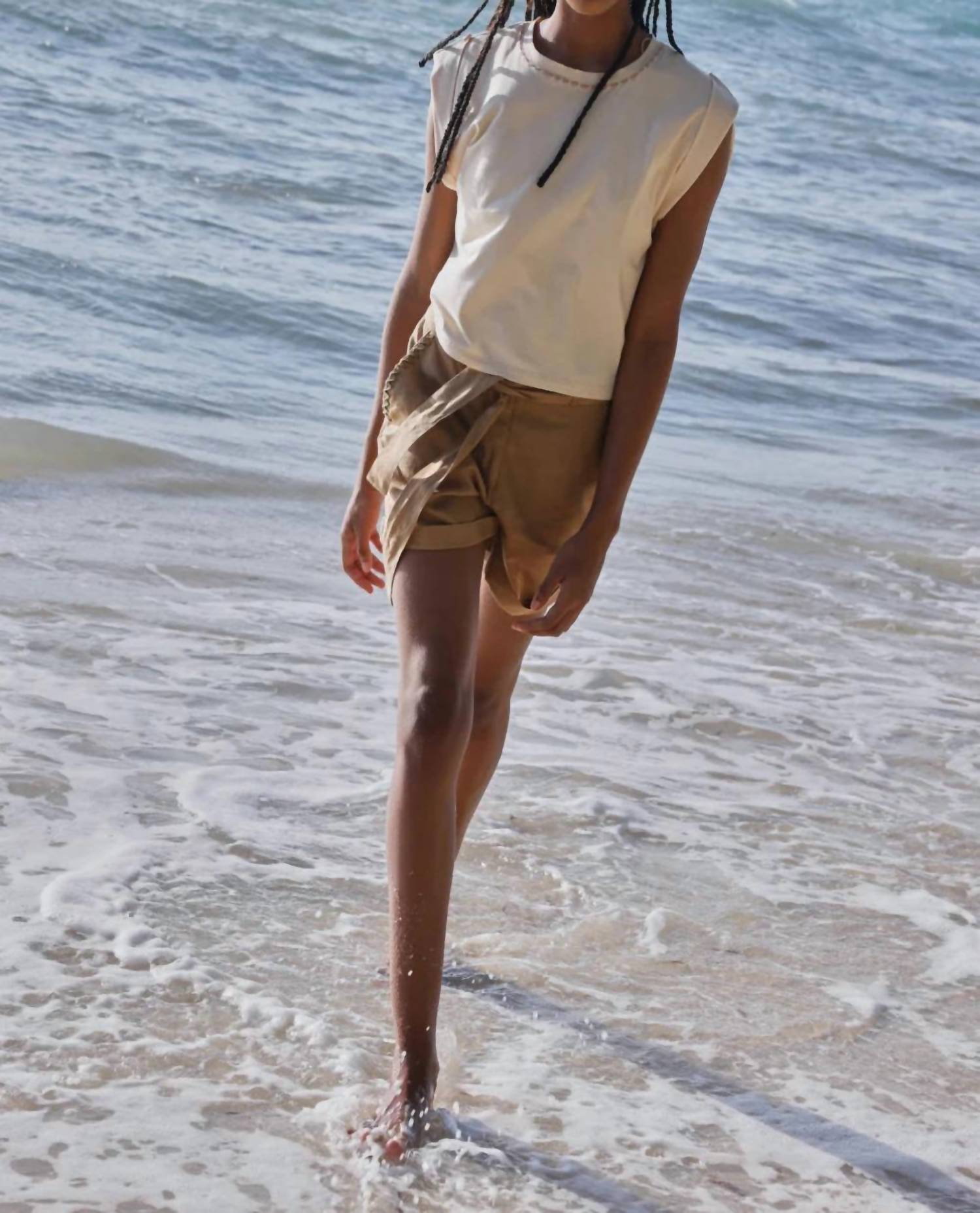 Elevate your summer wardrobe with the Cyprus T-Shirt by Pinkfilosofy, featuring delicate handcrafted embroidery on the collar for a touch of elegance. This ecru tee showcases a minimalist style with cap sleeves and a round neck, making it perfect for holiday parties. Crafted from 100% cotton, it ensures comfort and breathability. Closure: Pull on. Care instructions are not provided.