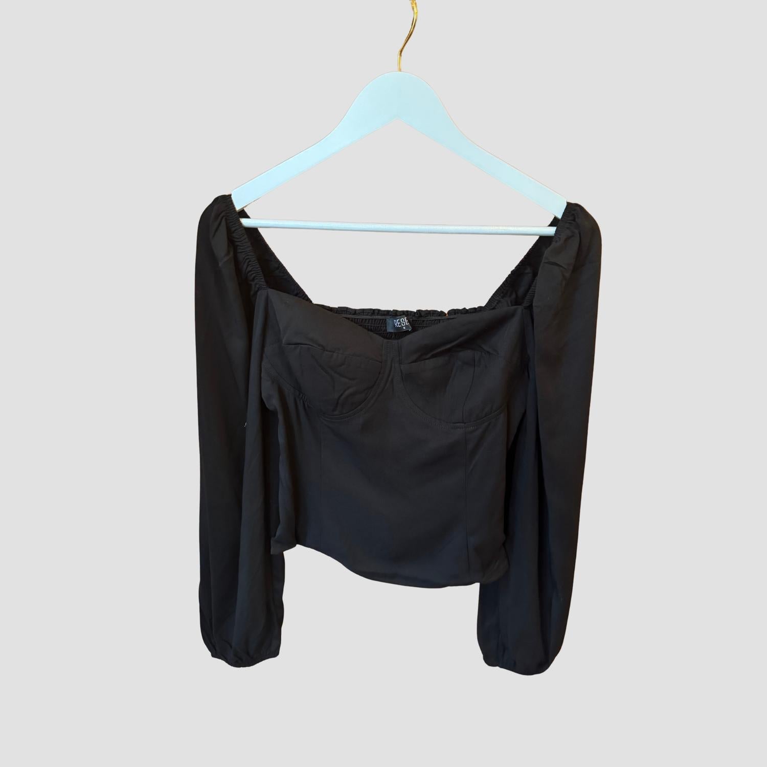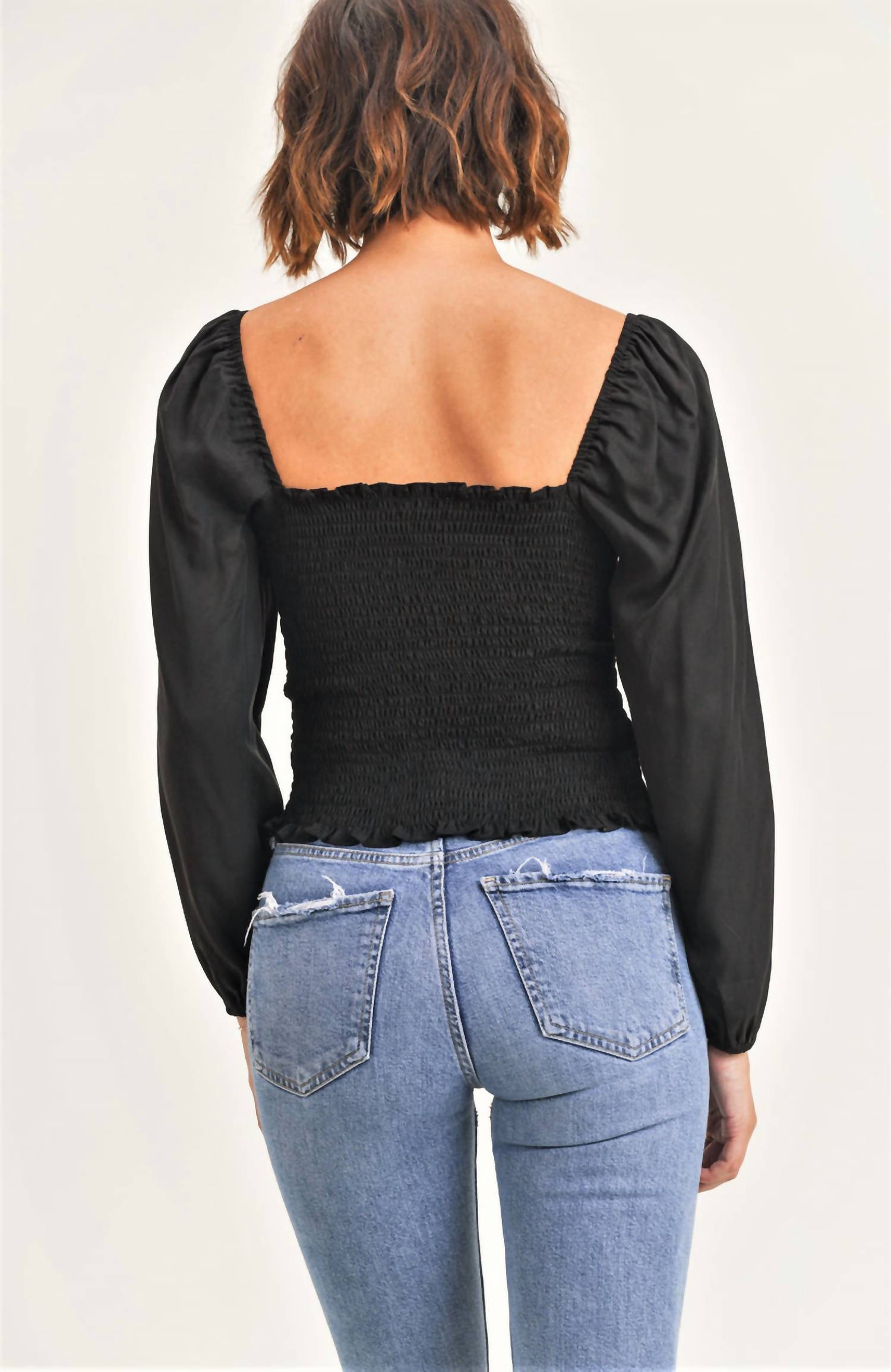 Introducing the Abby Long Sleeve Crop Bustier Top by RESET by Jane, a chic choice for any holiday party. Crafted from 100% rayon with a solid black hue, this top boasts long puff sleeves and a flattering sweetheart neckline. A smocked back and elastic shoulders and wrists ensure a perfect fit, while the side zip closure adds convenience. Model is wearing a size Small.