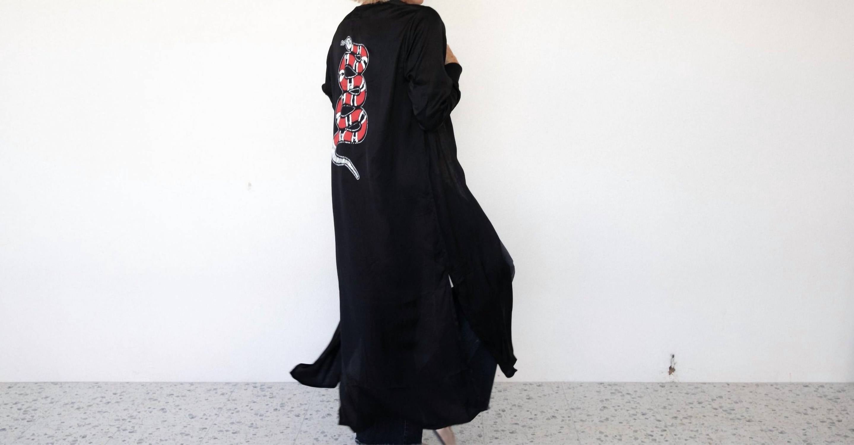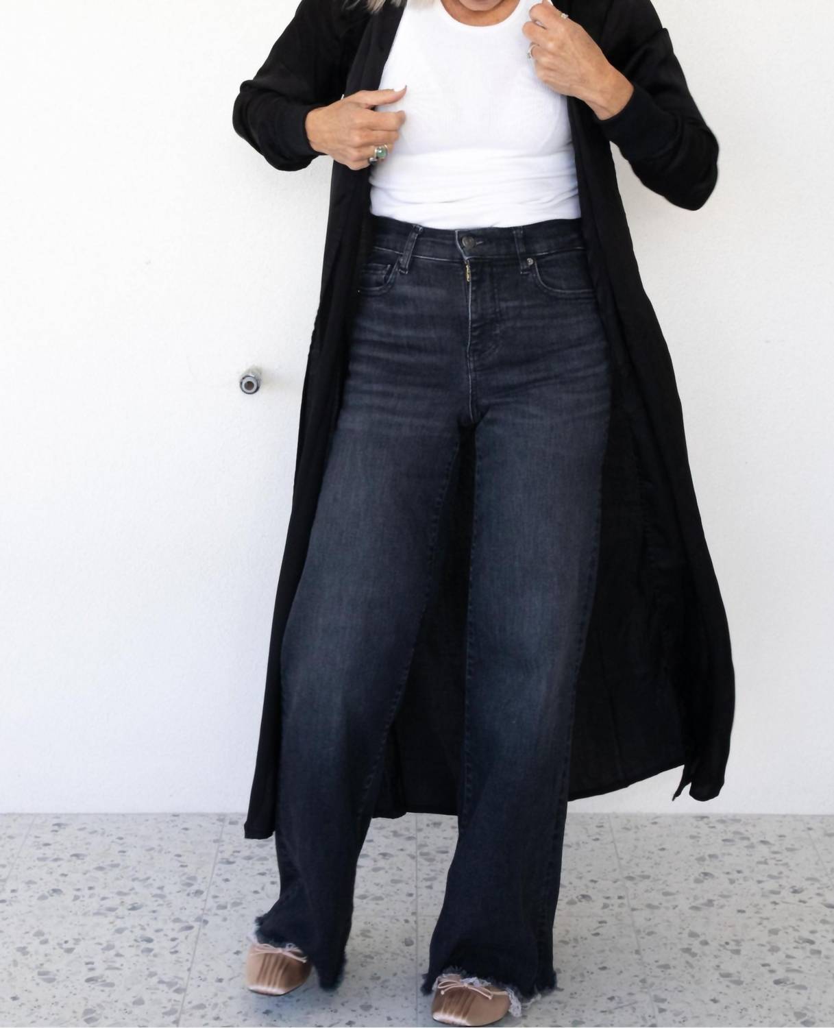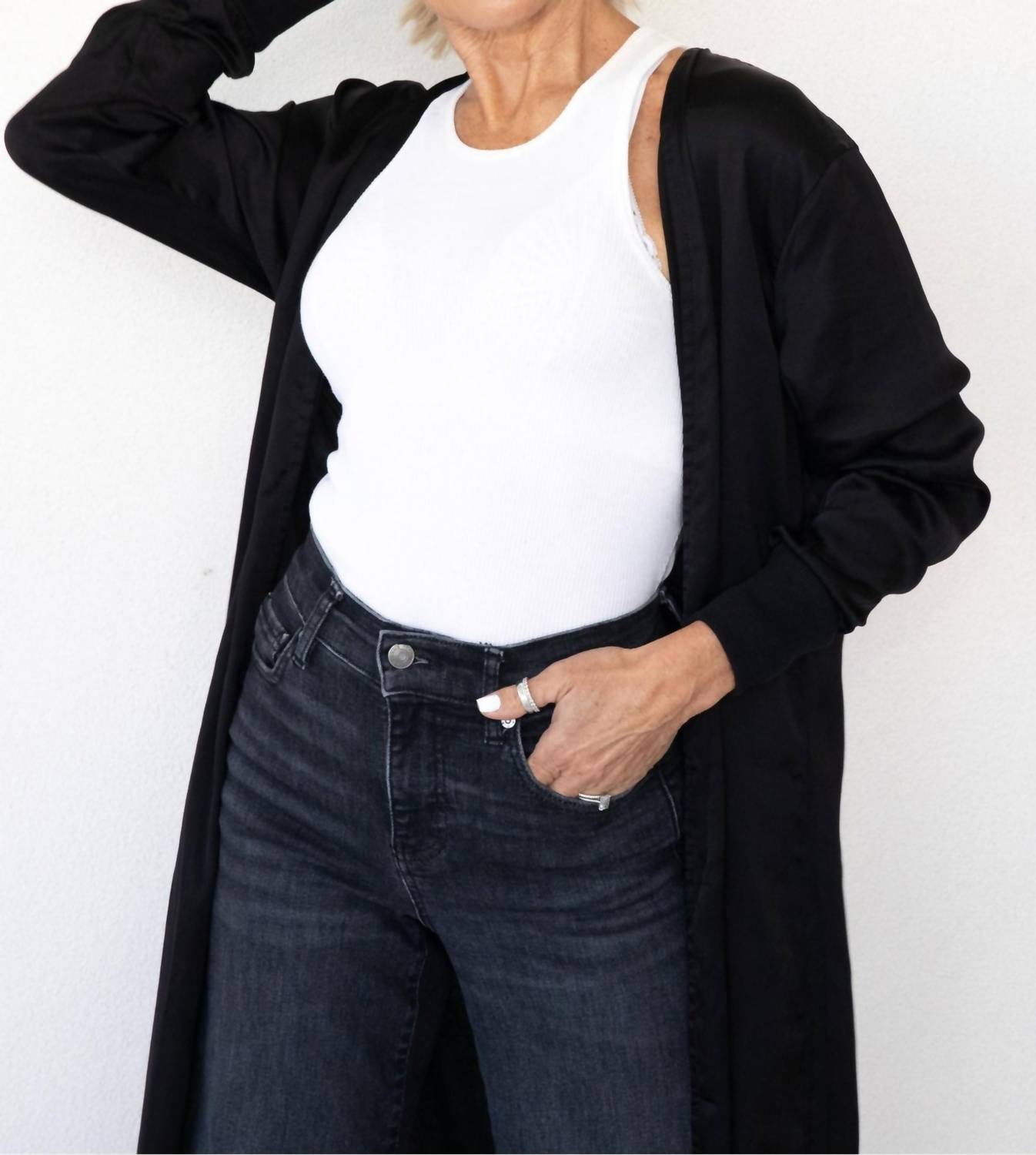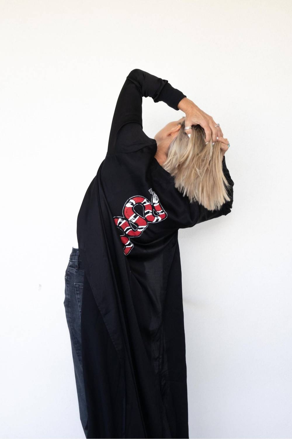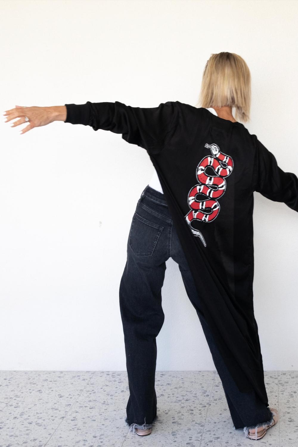 Introducing the Snake Duster from Angel Wings by Lucy, crafted to add a chic touch to any wardrobe. This long cardigan sweater in classic black features a stylish ribbed sleeve detail and snake print for a graphic finish, making it a standout piece for layering over denim or activewear. Made from 100% viscose, this cardigan boasts long sleeves and a trendy V-neck, ideal for embodying a 90s fashion vibe during fall occasions. Please note: care instructions are not provided. Lucy wears size XS.