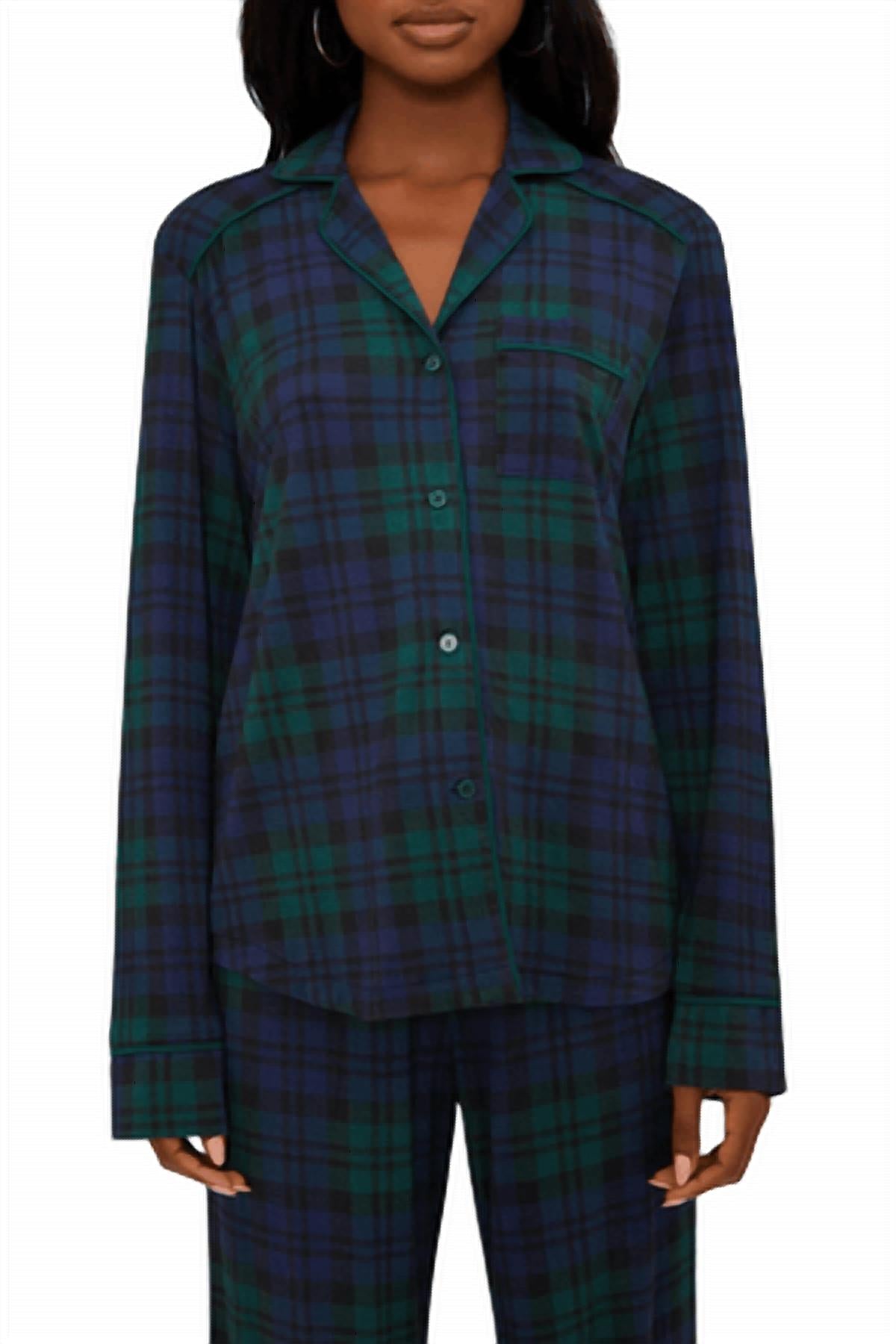 A peça perfeita para relaxar, dormir e preparar o café da manhã. O Conjunto de Pijama Livy Connie da Beach Riot é a escolha ideal para relaxar nas férias com o vibrante xadrez Wintergreen. Com mangas compridas e confeccionado em 95% modal e 5% elastano, este conjunto promete conforto ultramacio. A blusa com botões frontais vem com um bolso frontal e a calça inclui cós elástico com laço de fita ajustável, ambos adornados com debrum verde para um toque especial. O design estampado xadrez combina tons intensos de verde-oliva e azul-marinho, perfeito para um jantar sofisticado ou uma noite aconchegante em casa.