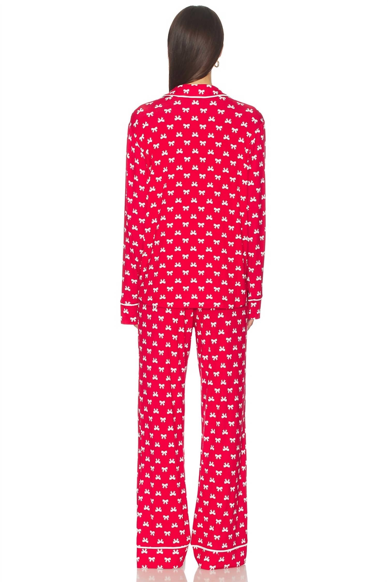 Introducing the Livy Top & Connie Pant Set by Beach Riot in a charming Peppermint Bows pattern, perfect for lounging or sleep. This two-piece pajama set features a button-front top with long sleeves and an eye-catching red base adorned with allover white bow prints. The set is crafted from a soft and stretchy blend of 95% Modal and 5% Spandex, complete with contrast piping and an adjustable tie waist for ultimate comfort. Care instructions recommend machine wash and laying flat to dry. Ideal for women seeking a relaxed fit with a classic 90s fashion touch for any housewarming this spring.