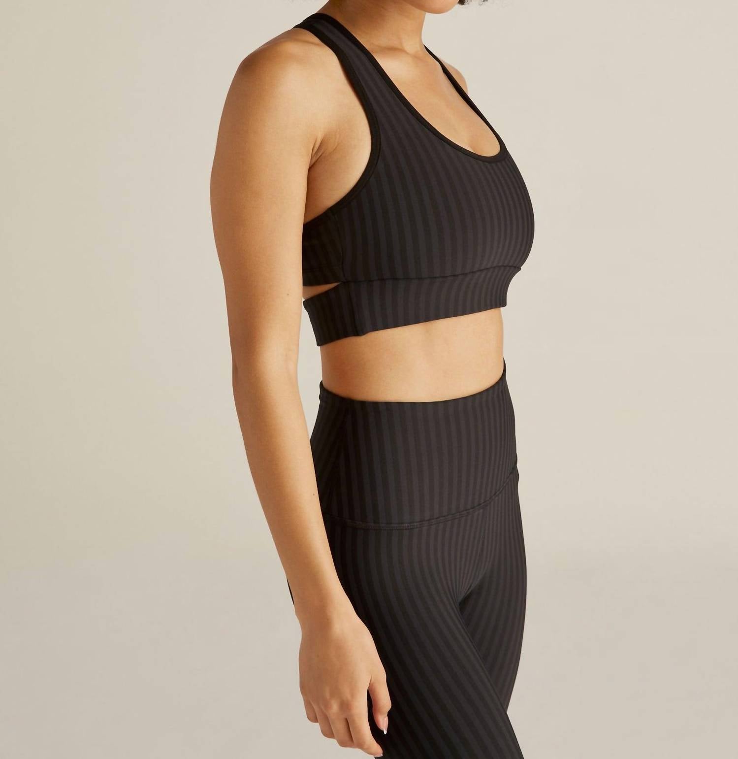 Um top esportivo que tem tudo: estilo, funcionalidade e sustentação. Projetado e fabricado nos EUA. Decote redondo. Costas nadador com recorte vazado. Forro próprio. Elástico de 5 cm na bainha. Suporte médio. Criado exclusivamente para valorizar todos os tipos de corpo. Jacquard listrado. 82% poliéster e 18% elastano, com absorção de umidade. Elástico em 4 direções. A modelo veste tamanho P.
