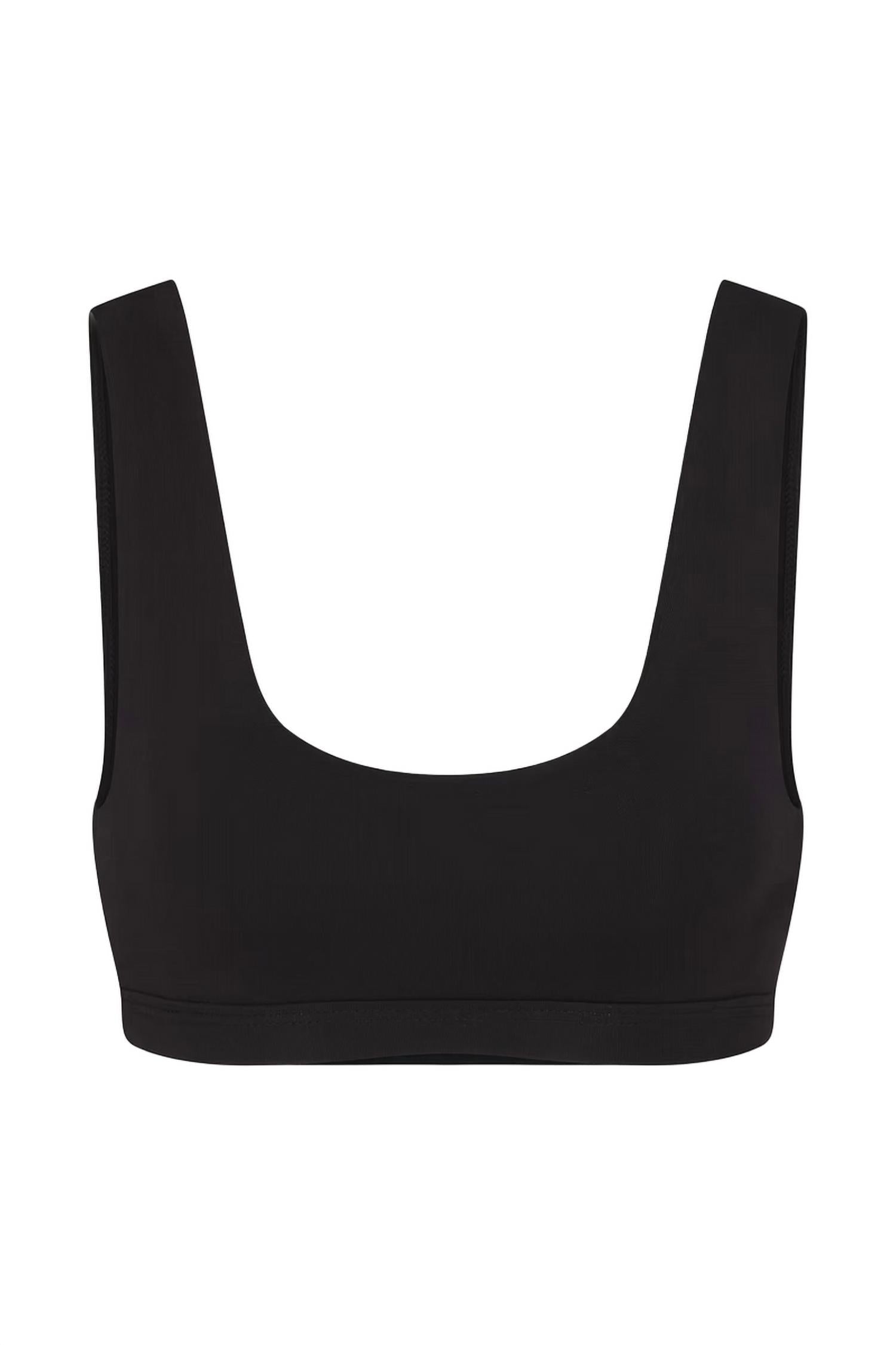 A sports bra that has it all - style, function and support. Discover the Eterne Scoop Neck Bra, an embodiment of minimalist sophistication and comfort in black. Crafted from an ultra-lightweight blend comprising 89% Modal and 11% Lycra, this solid sports bra is tailored for a true-to-size fit. Featuring a flattering scoop neck and wide straps, it offers both support and style, making it ideal for vacation or everyday wear. For best care, machine wash cold, use non-chlorine bleach, tumble dry low, and cool iron. Model is 5'10" and wearing size S.