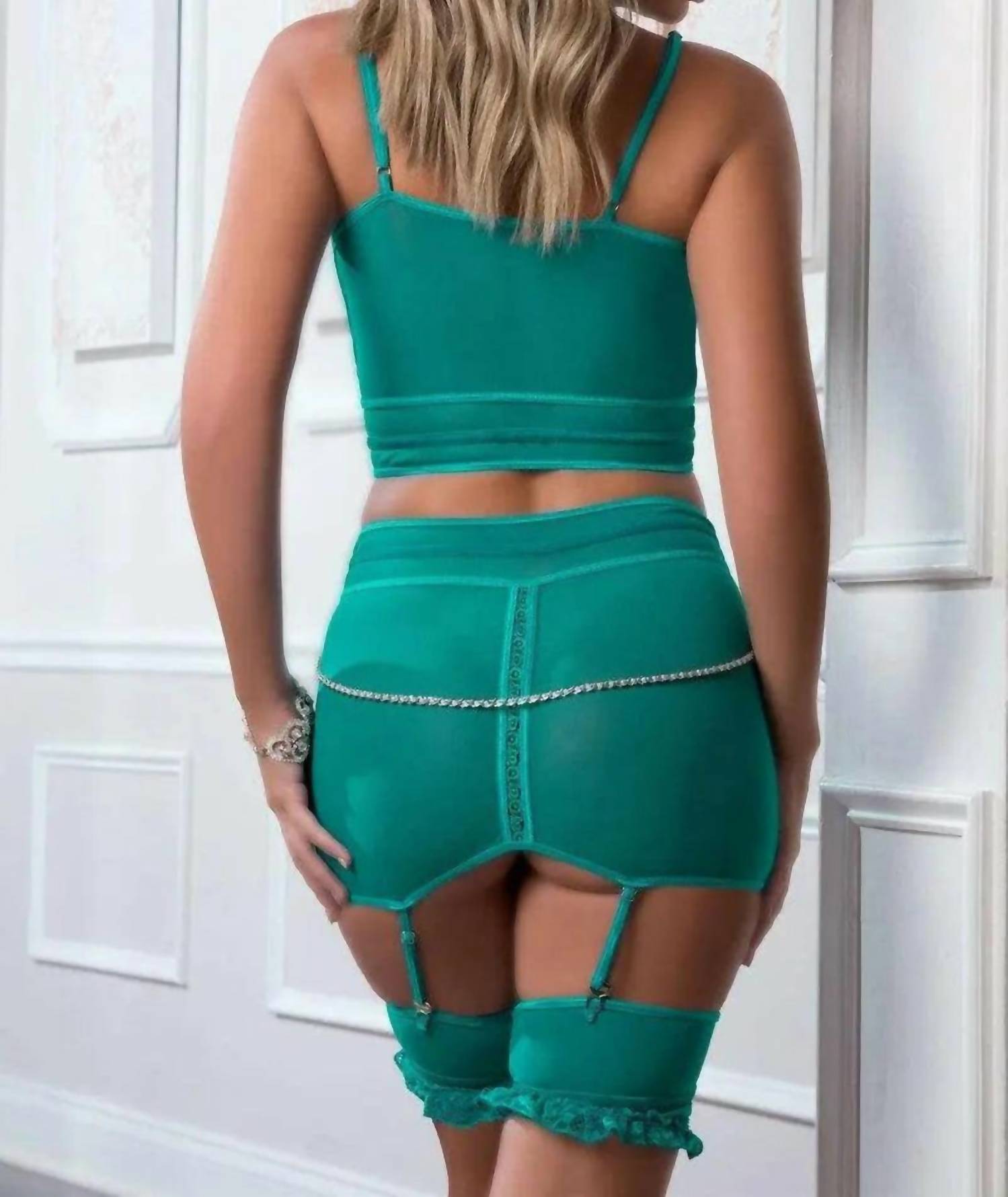 Aumenta a confiança. Aumente seu charme com o Conjunto Bustiê e Saia-Liga Defining da G World Collection, uma obra-prima em azul-petróleo turquesa, perfeita para ocasiões especiais. Este bustiê longo apresenta renda floral suntuosa e bordados, complementados por uma corrente de pérolas que acentua as curvas do corpo. O detalhe de zíper frontal aberto adiciona um toque ousado, enquanto as tiras de veludo e o corte alto definem e realçam suas curvas. Completo com uma saia-liga combinando em malha transparente e acabamento em renda, este conjunto é um triunfo de cobertura total na sedutora moda dos anos 90.
