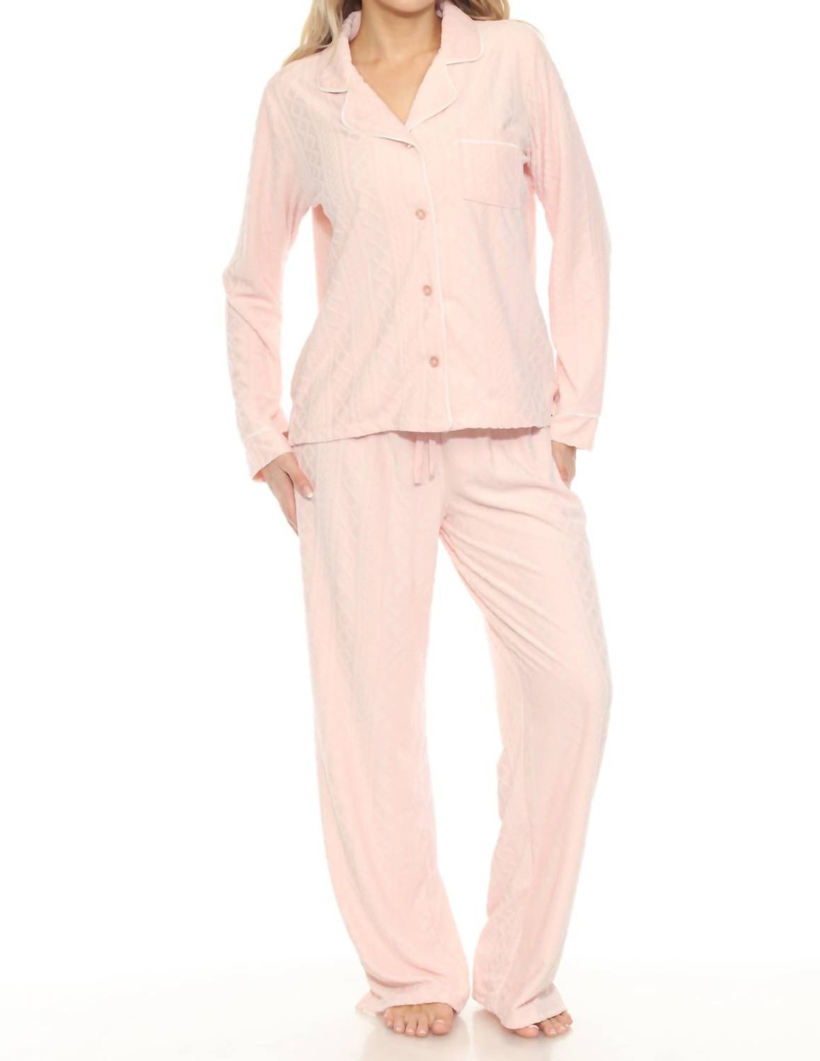 Experimente o luxo aconchegante com o Pijama Feminino Very Terry Cable Crew da PJ Salvage, perfeito para relaxar com estilo. Este pijama possui mangas compridas e uma silhueta estruturada em malha chenille de poliéster ultramacia. Completo com gola entalhada clássica, fecho frontal por botões e um elegante bolso no peito esquerdo, este top em tom rosa sólido adiciona um toque elegante a qualquer coleção de roupas confortáveis. Perfeito para noites mais frias ou manhãs preguiçosas, esta peça importada foi projetada para manter você aquecido e confortável.