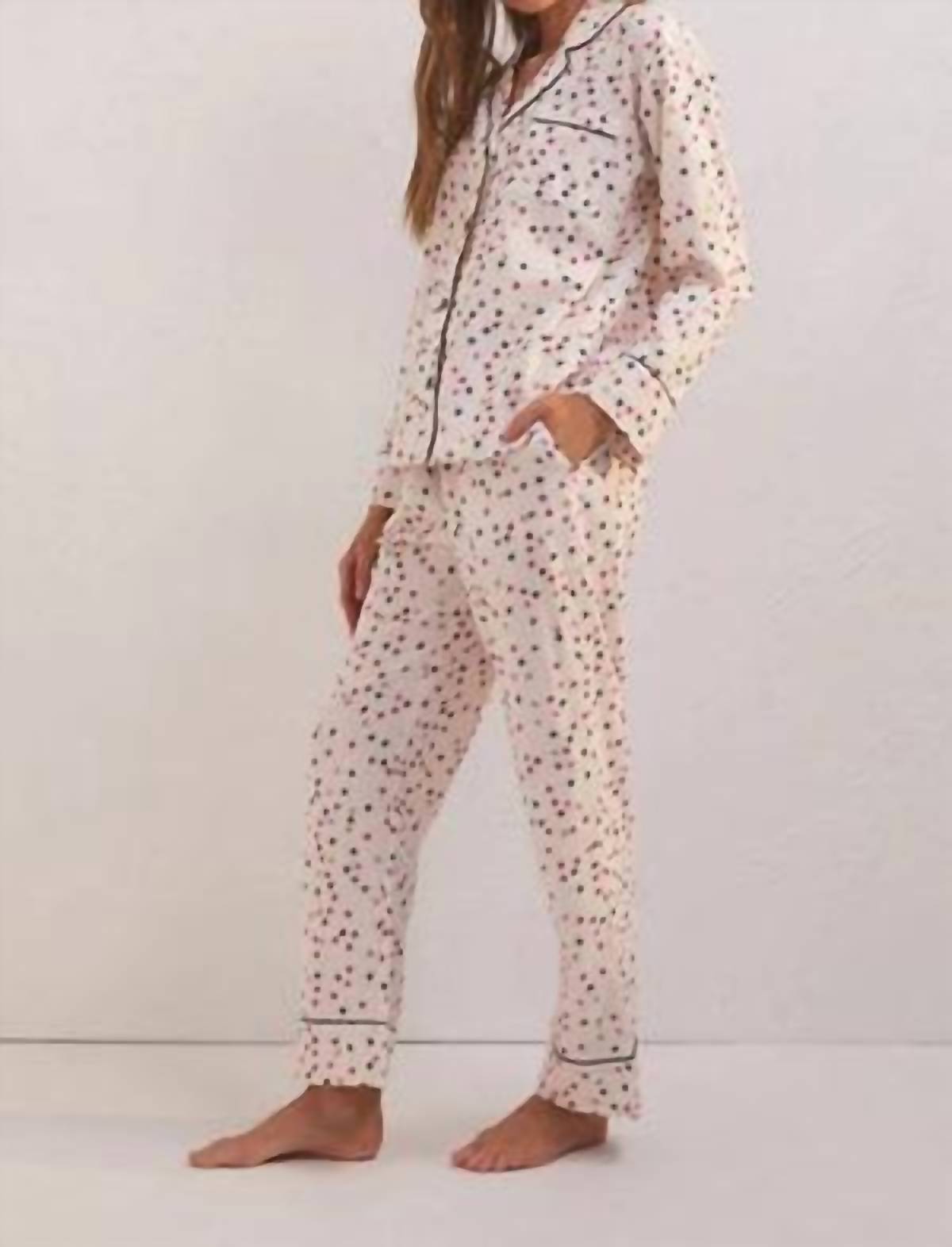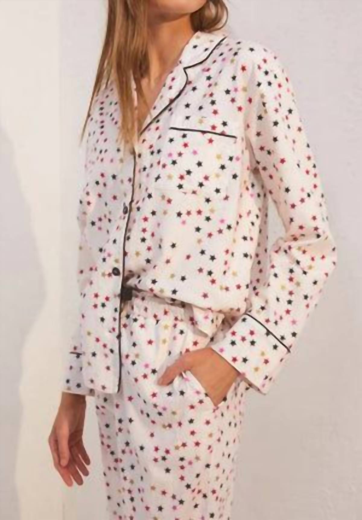 Apresentamos o Conjunto de Pijama Dreamer Star da Z Supply, uma escolha aconchegante para noites estreladas na cor Vanilla Ice. Com mangas compridas e confeccionado em flanela 100% algodão, este conjunto promete conforto com seu design clássico de gola e detalhes em vivo contrastante. Fechamento: Abotoado. Cuidados: Lavar à máquina com água fria e secar em temperatura baixa. A modelo mede 1,78 m e veste tamanho P.