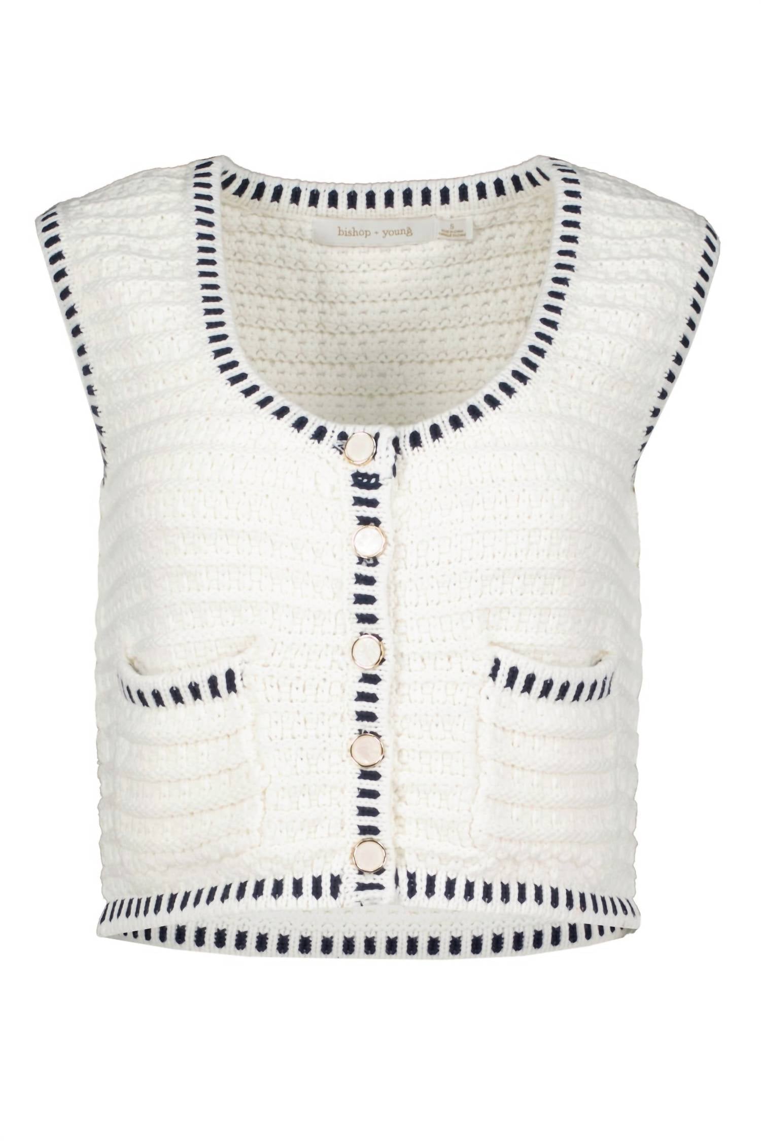 A vest so versatile you can mix and match it with almost any outfit and it will feel brand new every time. Introducing the Bishop & Young Luxe Crochet Sweater Vest in a charming ivory hue, perfect for adding a chic touch to your summer wardrobe. This sleeveless vest features a cozy crochet texture and a playful cropped silhouette, ideal for minimalist styling. Made from 100% Cotton, it includes a button closure for easy layering. Care for this unique piece by dry cleaning only to maintain its elegance.