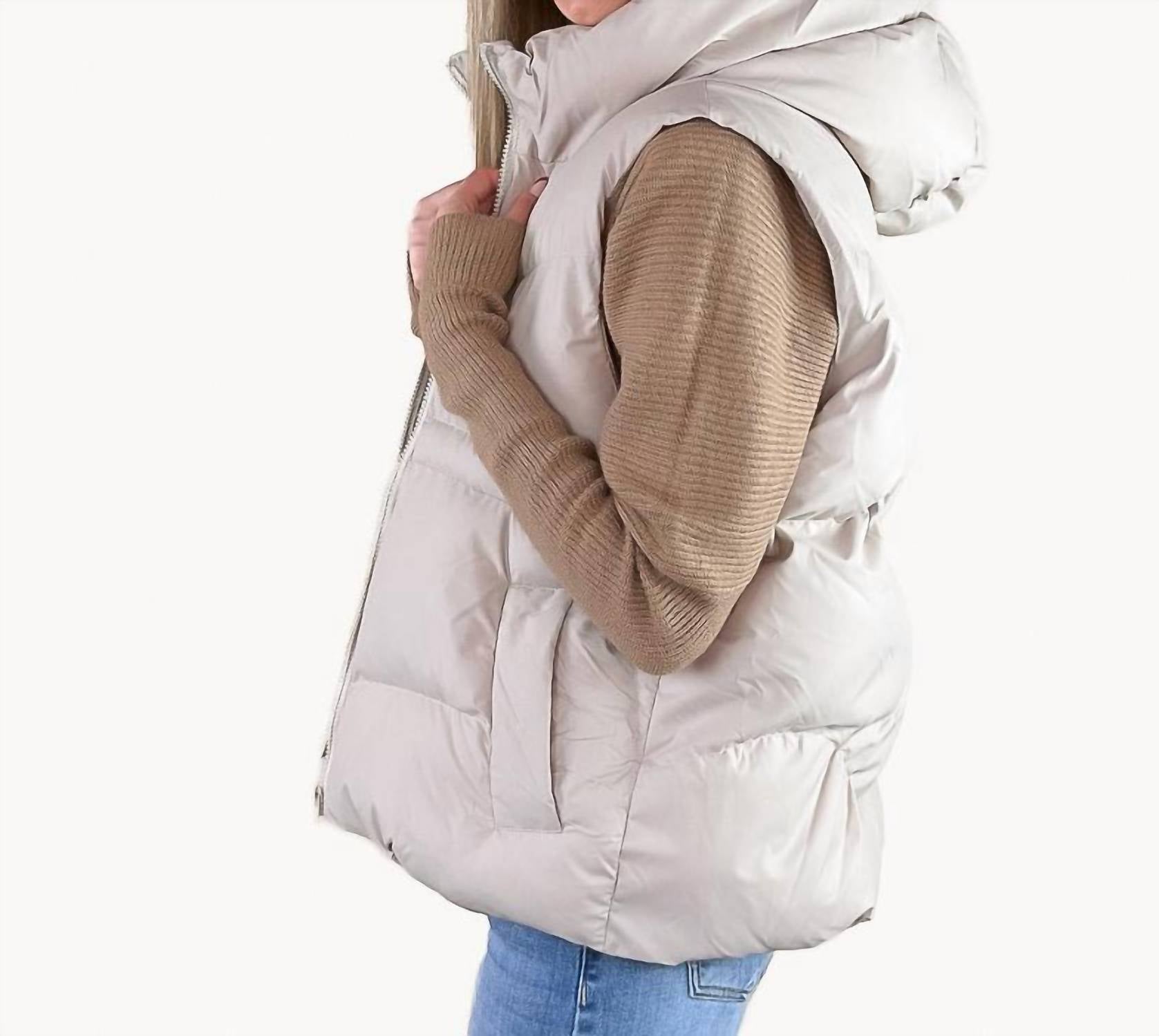 Throw this vest over an all black outfit for a perfectly polished look. The Zipper Down Puffer Hooded Vest by BluIvy is your go-to essential for cold weather layering. This sleeveless vest is crafted from 100% polyester, ensuring optimal insulation and warmth without added bulk. It's designed in a stylish mushroom color, featuring a zip closure and functional pockets, making it the practical choice for outdoor activities or casual wear. With its minimalist, solid pattern and cozy hood, this vest perfectly combines style and protection for your travel and winter adventures.