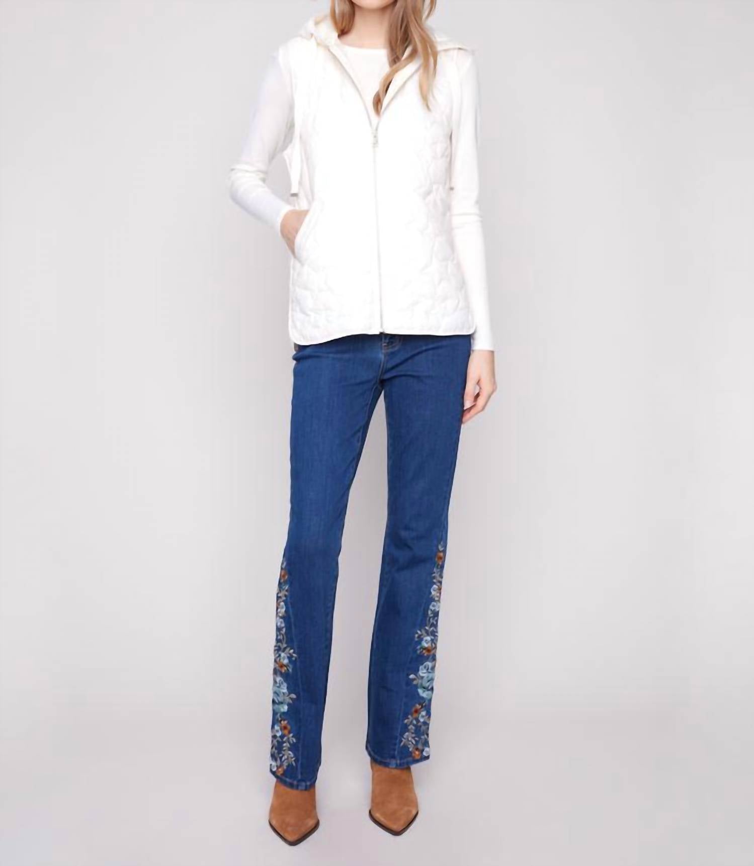 Elevate your fall wardrobe with the Short Stars Quilted Puffer Vest by CHARLIE B in a chic ecru hue. This women's vest features short sleeves and a zip closure for a snug and cozy fit. The shell is crafted from 100% nylon, offering lightweight warmth with a back length of 27.5 inches. Care for this minimalist staple with delicate cold water washing, refrain from bleaching, hang to dry, and iron on a low setting if needed.