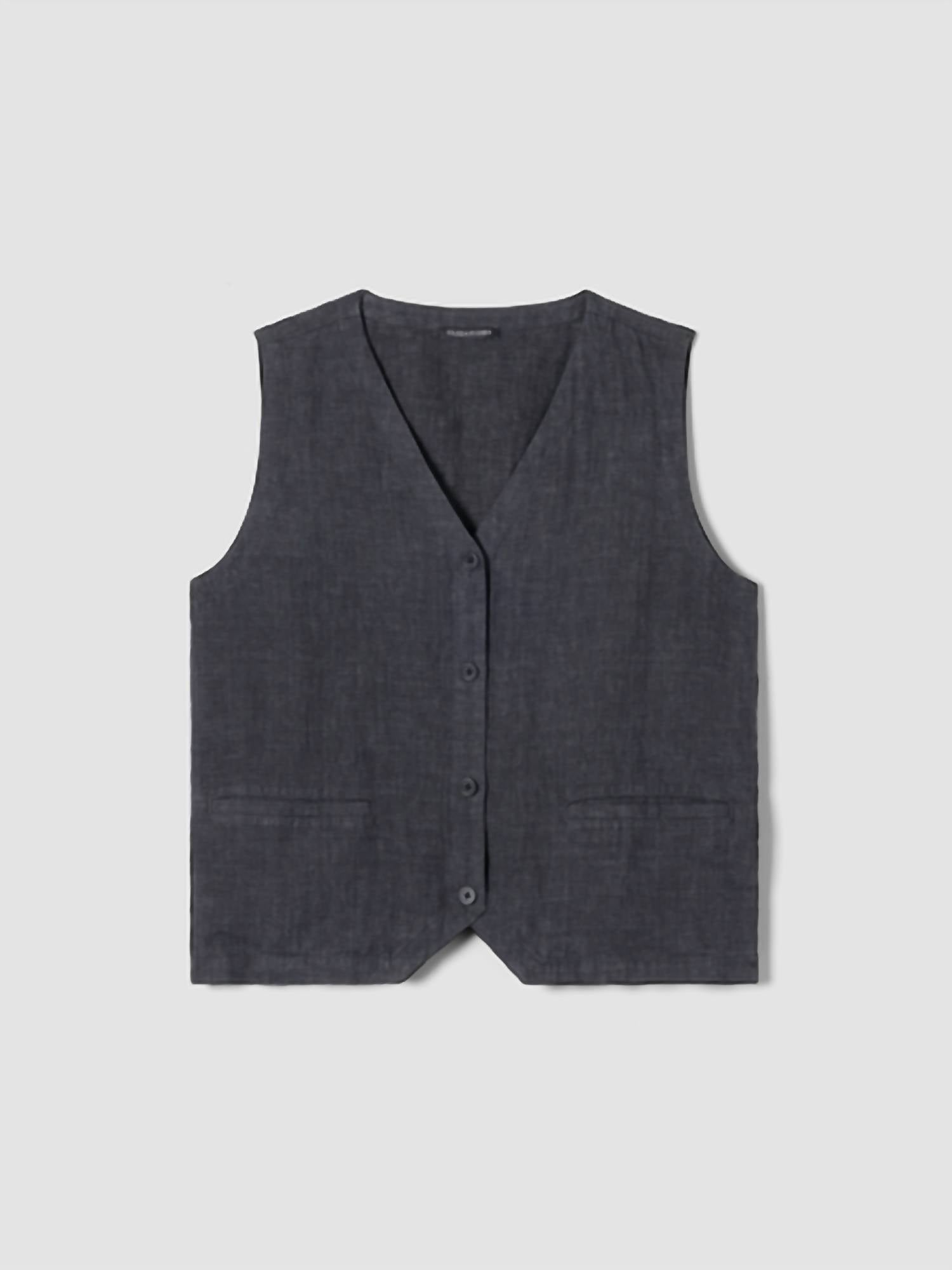 Throw this vest over an all black outfit for a perfectly polished look. Meet the Washed Organic Linen Délavé Vest by Eileen Fisher, perfect for minimalist style during spring occasions like Thanksgiving. This sleeveless vest features a V-neck, button front with corozo buttons, and convenient welt pockets, with a self-tie detail at the back for an adjustable fit. Crafted from 100% organic linen, it's sourced from Indonesia and is designed to flatter with a silhouette that's close at the shoulders and wider at the hem. Care for it easily by machine washing cold and tumble drying low, ensuring lasting wear and unique délavé color.
