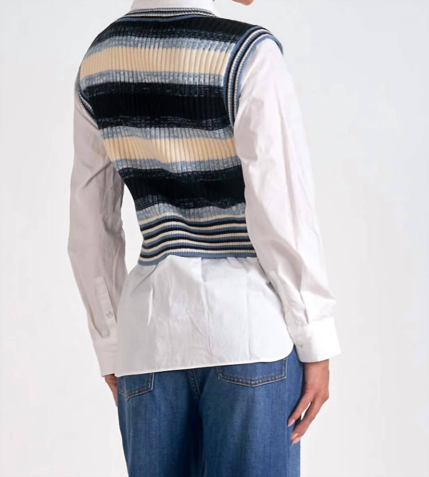 Use este colete sobre uma roupa toda preta para um visual perfeitamente elegante. Esta camisa-suéter apresenta um suéter de malha listrada sobre uma camisa branca clássica de botões. Confeccionada em 42% acrílico, 30% poliéster, 28% náilon e 100% algodão, possui decote em V e fecho pull-on para uma combinação de estilo e conforto.