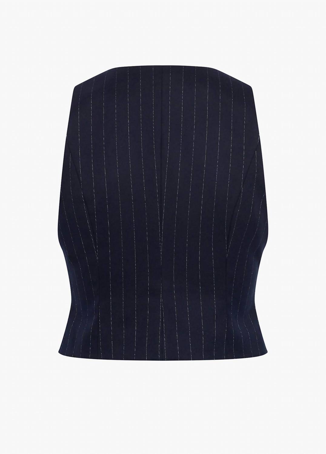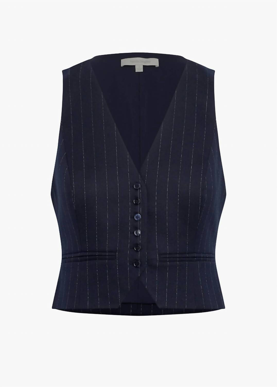 Throw this vest over an all black outfit for a perfectly polished look. Elevate your workwear wardrobe with the Crop Vest Top by Favorite Daughter, a sophisticated piece in a navy pinstripe. This sleeveless vest features a V-neckline and convenient front button closures. Crafted from high-quality polyester, the vest exudes elegance while offering a minimalist design that pairs perfectly with denim or as a chic set with The Favorite Pant. With dry clean care, it's a timeless addition perfect for spring dinner parties.