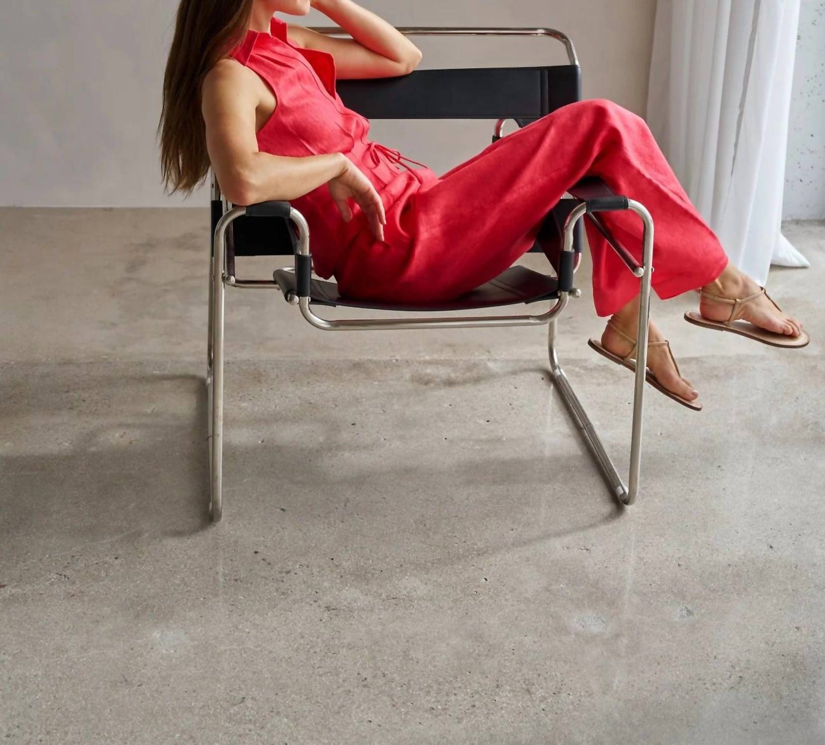 Introducing the Sloan Linen Vest by Hevron, a chic addition to your summer wardrobe, perfect for cocktail parties and workwear alike. This sleeveless vest is crafted from 100% linen, offering a breathable and stylish option for the season. Designed with a deep V-neck and a flattering pull-on closure, it showcases a sophisticated red hue that stands out. Care for it is simple: machine wash as needed and lay flat to dry.
