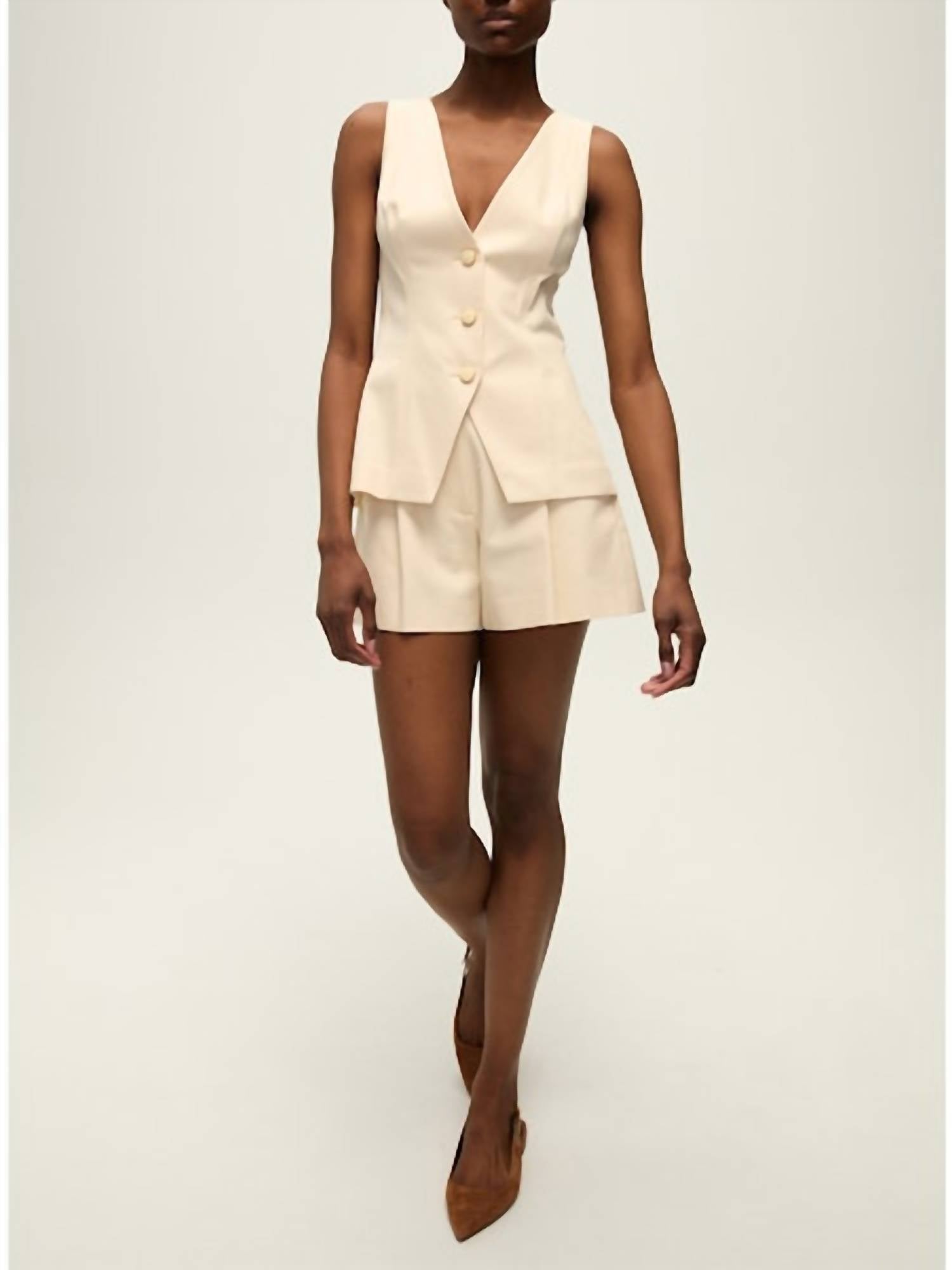 A vest so versatile you can mix and match it with almost any outfit and it will feel brand new every time. Introducing the Avalina Vest by Veronica Beard, a must-have for chic, minimalist style this Thanksgiving season. This sleeveless vest in elegant ecru boasts a flattering V-neckline and is crafted from a soft, breathable stretch-cotton blend for comfort. Composition: 55% Lyocell, 42% Cotton, 3% Elastane with a 100% Polyester lining. Closure: Signature crest button closure. Care: Dry clean only.