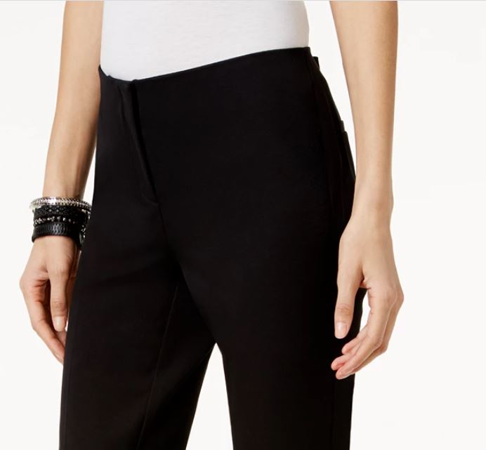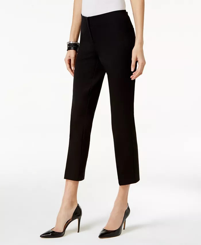 Mid rise; skinny fit through hips and thighs; skinny leg cropped above ankle|Approx. inseam: 22"|Zipper and clasp closure at front; hidden elastic waistband|Welt pockets at back hips|Cotton/rayon/spandex|Machine washable