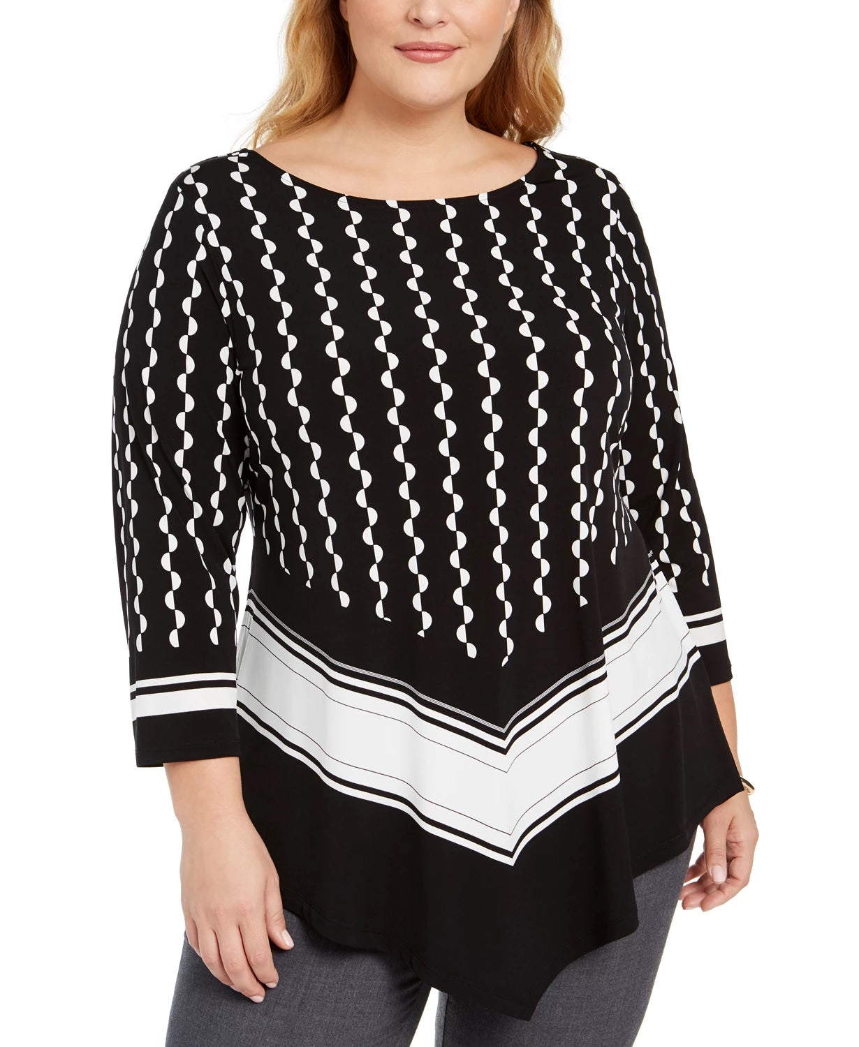 Approx. 33-1/2 long|Scoop neckline|Mixed prints; V-hem|3/4-sleeves