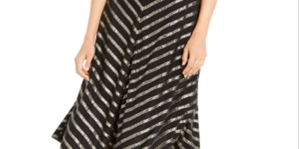 Shimmering asymmetrical stripes are the aesthetic in this skirt by Alfani with a midi length and an A-line silhouette with pleats. | Approx. 32 long| Zipper closure; A-line silhouette| Pleated| Rayon/nylon/metallic; lining; polyester| Machine washable
