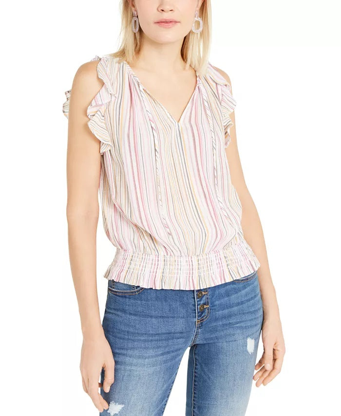 Scoop neckline|Smocked hem|Ruffles at armholes|Rayon/cotton/metallic threading