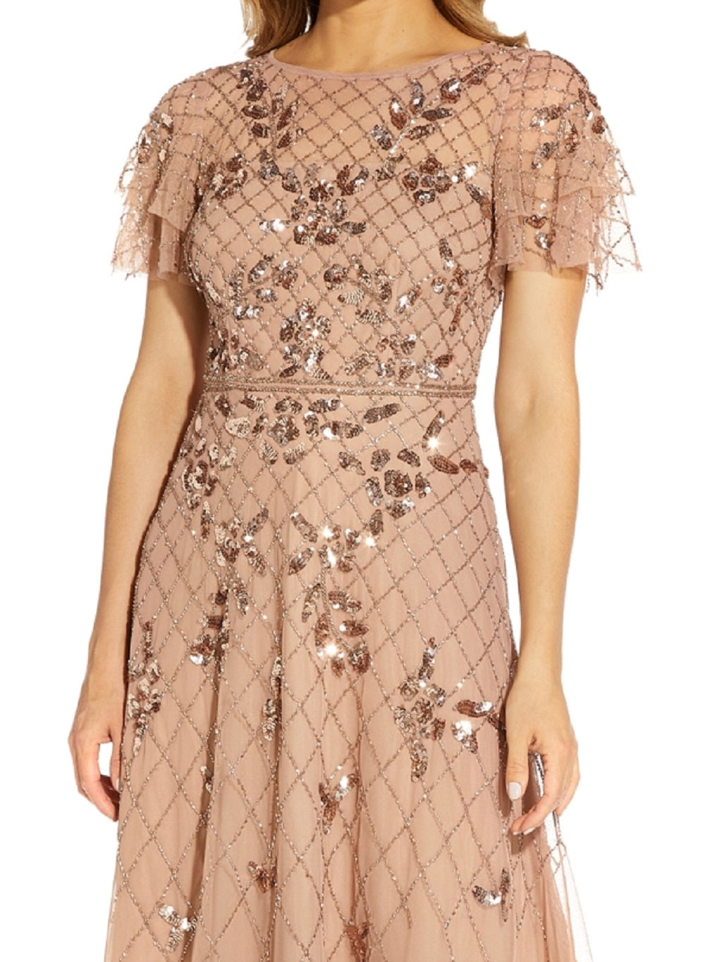 Sequins and beads dazzle with tone-on-tone dimension in this flutter-sleeve fit & flare dress from Adrianna Papell.| Approx. 38-3/4 long from center back neck to hem. Length varies 1/4 between sizes| Fitted through the chest and waist; flared and flowing skirt| Boat neckline; Fit & flare silhouette| Hidden zipper at center back| Tiered short flutter sleeves | Sequin floral patterning over lattice beading
