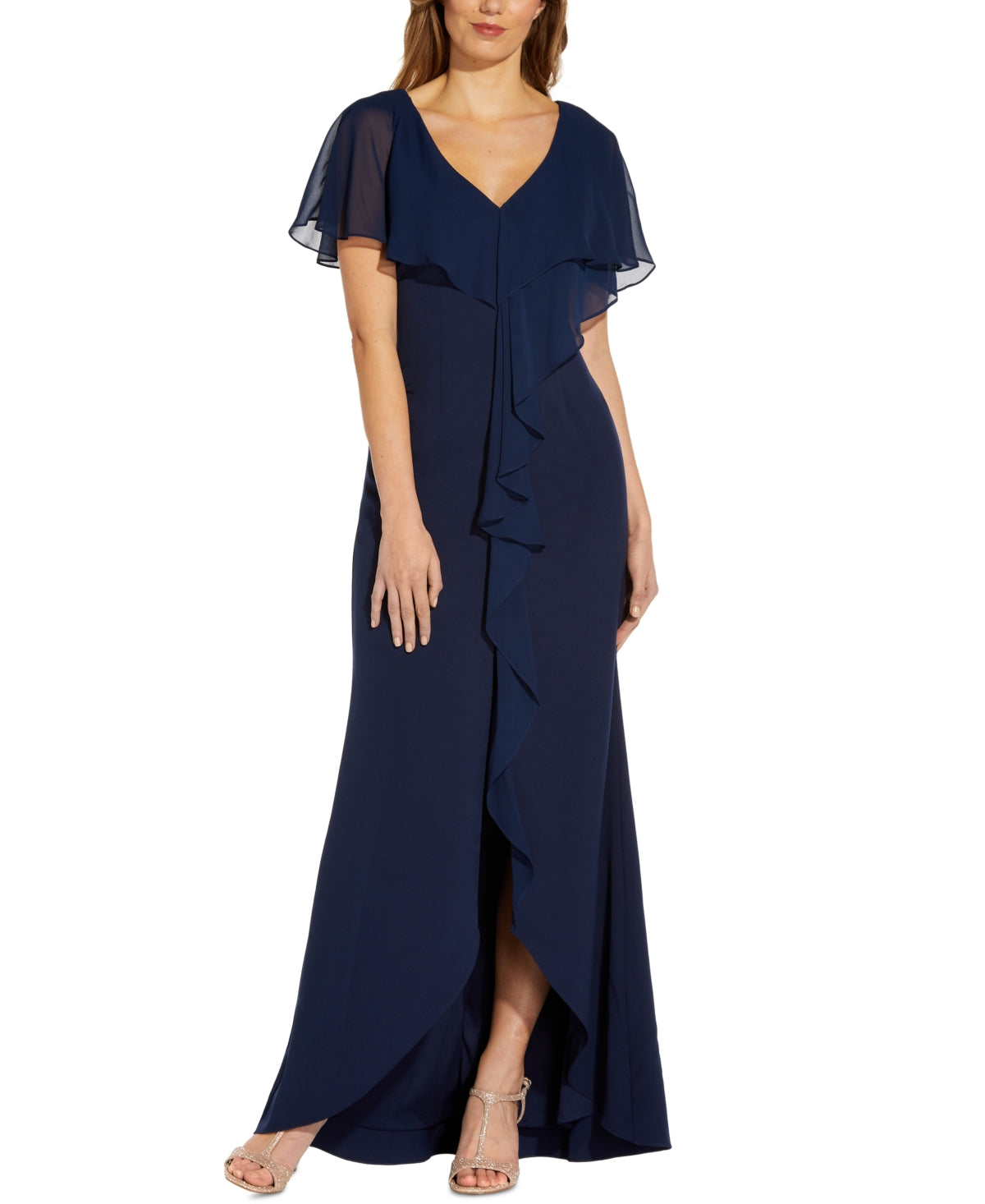 Sheer sleeves| flowing ruffles and a high-low hem turn up the elegance on this formal gown from Adrianna Papell. | Approx. 62 long from center back neck to hem. Length is based on size 4 and varies 2/5 between sizes| Floor-length formal dress| V-neck; Gown silhouette | Back zipper closure | Ruffled detail at front; high-low hem