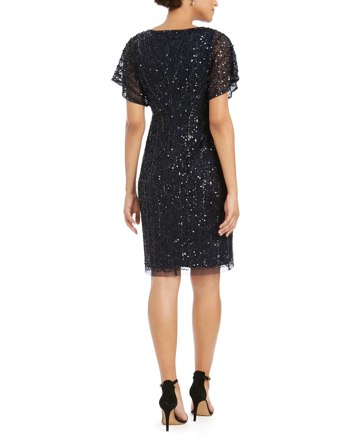 Approx. 38-1/8" long from center back neck to hem. Length is based on size 4 and varies 1/4" between sizes|V-neck; Sheath silhouette|Hidden back zipper with hook-and-eye closure|Flutter sleeves|Allover beads and sequins|IMPORTANT NOTE: This item arrives with a return tag attached and instructions for removal. Once the tag is removed from the dress, this item cannot be returned.
