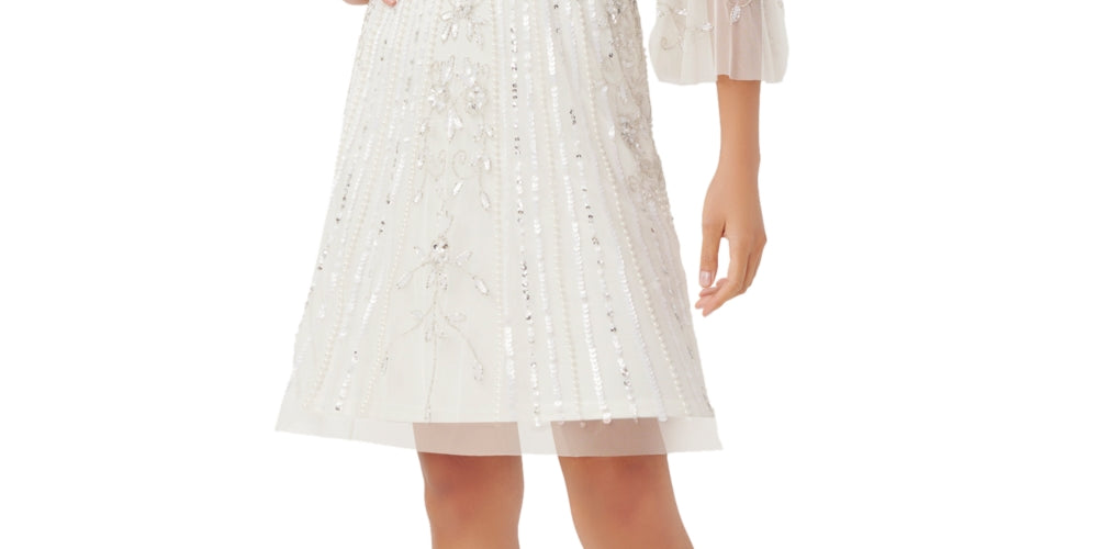 Ethereal and dreamy| this Adrianna Papell dress is a whole vibe with its sheer sleeves| embellished details and floaty silhouette.| Approx. 44 long from center back neck to hem. Length varies 1/4 between sizes| Fitted through the chest and waist; structured A-line skirt sits slightly over hips| Boat neckline with illusion details; A-line silhouette| Back zipper closure