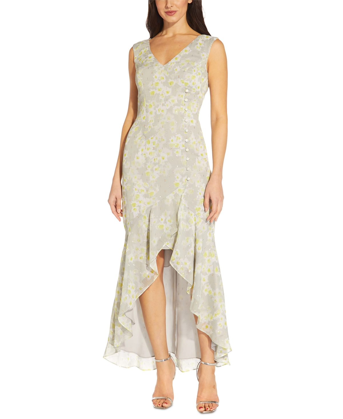 A ruffled high-low hem lend a flirty look to this dress from Adrianna Papell. Pair with heels for a stunning finish.| Approx. 27 long from front shoulder to hem | Floor-length formal dress| Jacquard; Textured and structured | V-neck; Mermaid silhouette| Back zipper closure| Covered buttons at left bodice; ruffled high-low hem