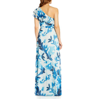 Adrianna Papell Women's Metallic Crinkle Mesh One Shoulder Gown Blue Size 8