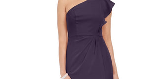 Adrianna Papell Women's Zippered Slitted Short Sleeve Asymmetrical Neckline Full Length Sheath Dress Purple Size 6