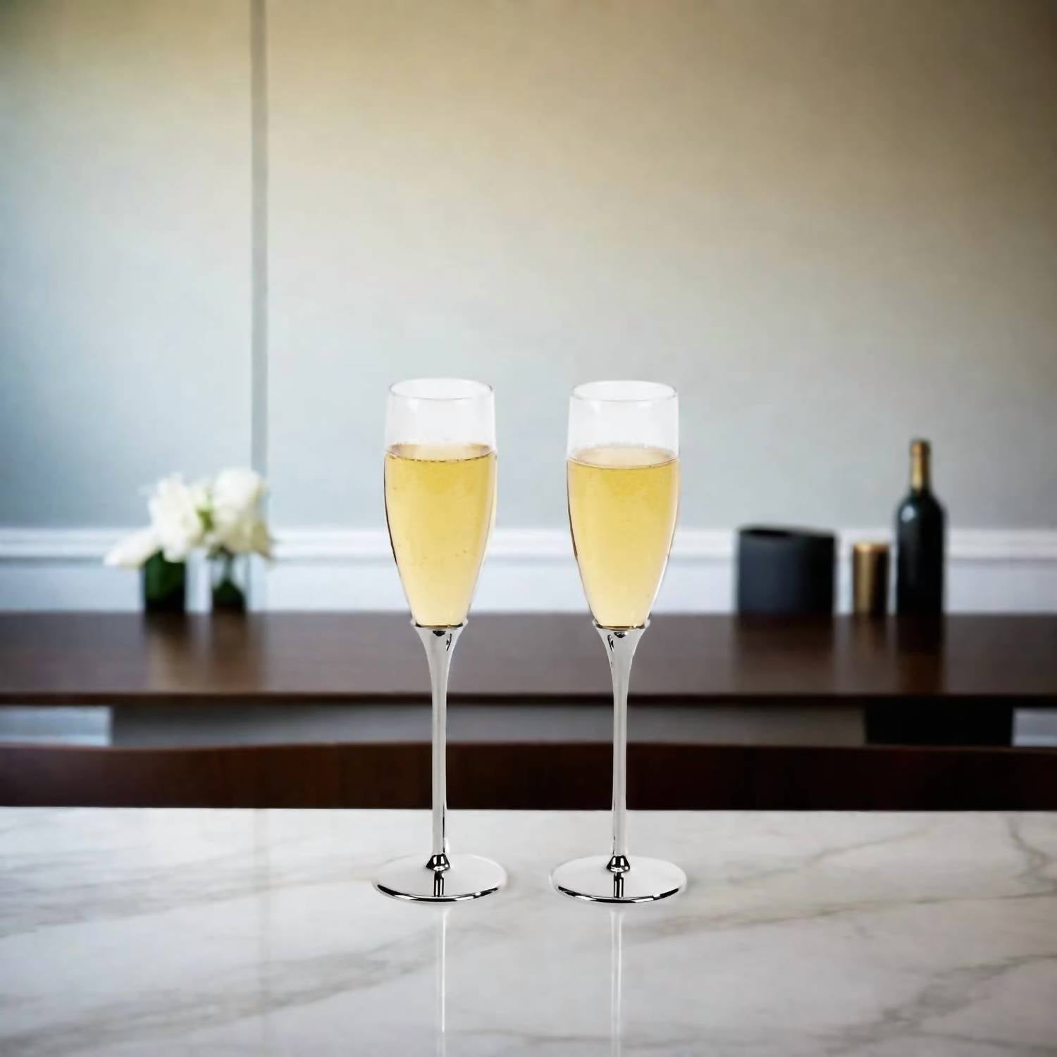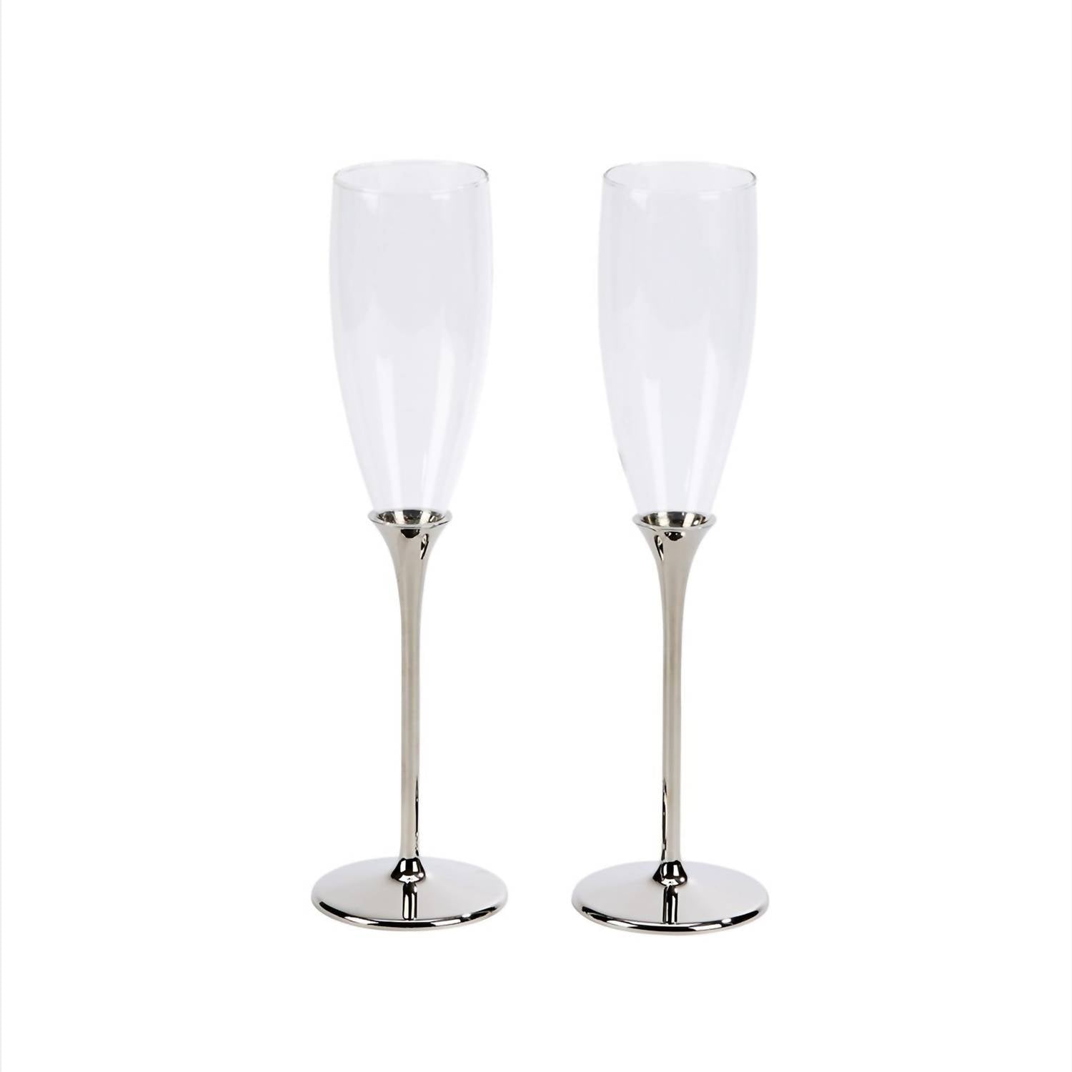 Graceful height of 10.25 inches for special occasions. Elegant nickel-plated design for weddings, graduations, and more. Clear glass flute bowl for watching champagne bubbles. Non-tarnishing nickel-plated metal stem and base. Customizable with engraved monogram or initials. Presented in a stylish silver gift box for easy gifting.