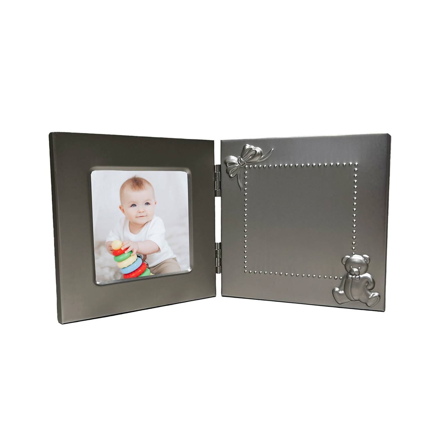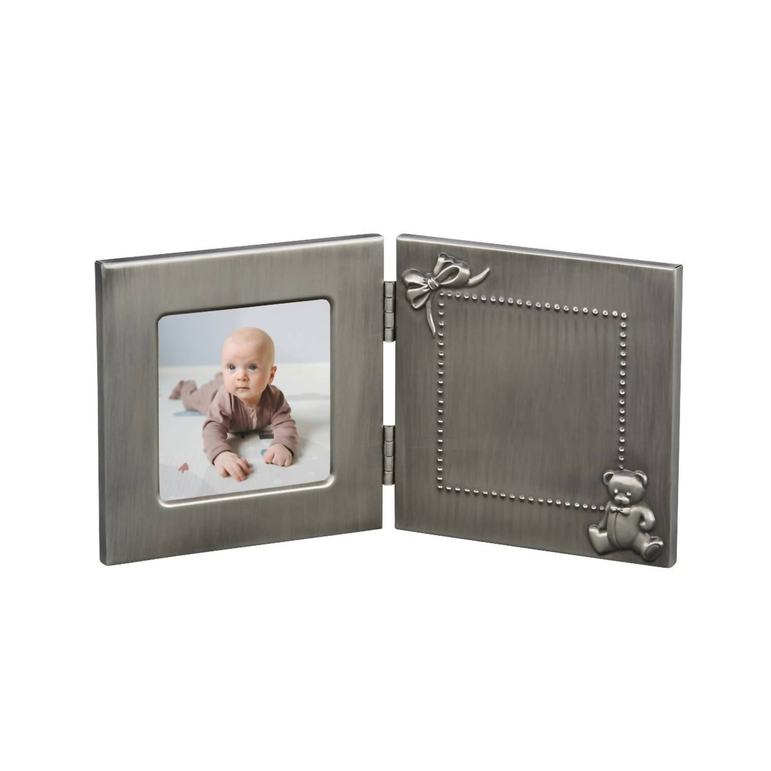 Capture sweet memories with the Hinged Baby Frame by Creative Gifts International, elegantly designed with a charming teddy bear and bow motif. Crafted from a non-tarnish pewter finish, it adds a whimsical yet classy touch to your nursery decor. This versatile frame holds a 3" x 3" photo and measures 10" L x 0.5" W x 5" H, complete with hooks for easy wall mounting. A beautifully packaged gift in a white box, perfect for celebrating your little one's milestones.