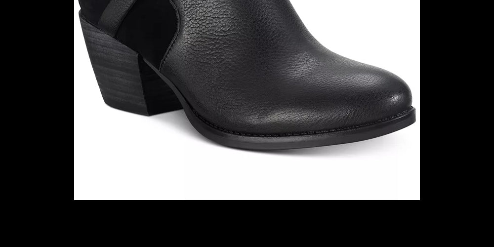 2-3/8" block heel|Shaft height: 4"; Circumference: 10"; measured on a size 6|Round-toe booties with a full side zipper closure|Mixed textures; crisscross strap with grommet detail|Cushioned insole|NOTE: Shaft height and circumference vary by size