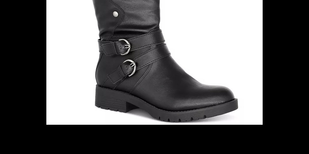 1-1/2" block heel|Round-toe riding boots with a full side zipper closure|Buckled straps and slouching at upper|Cushioned insole for added comfort|NOTE: Shaft height and circumference vary by size|Manmade upper; manmade lining; rubber sole