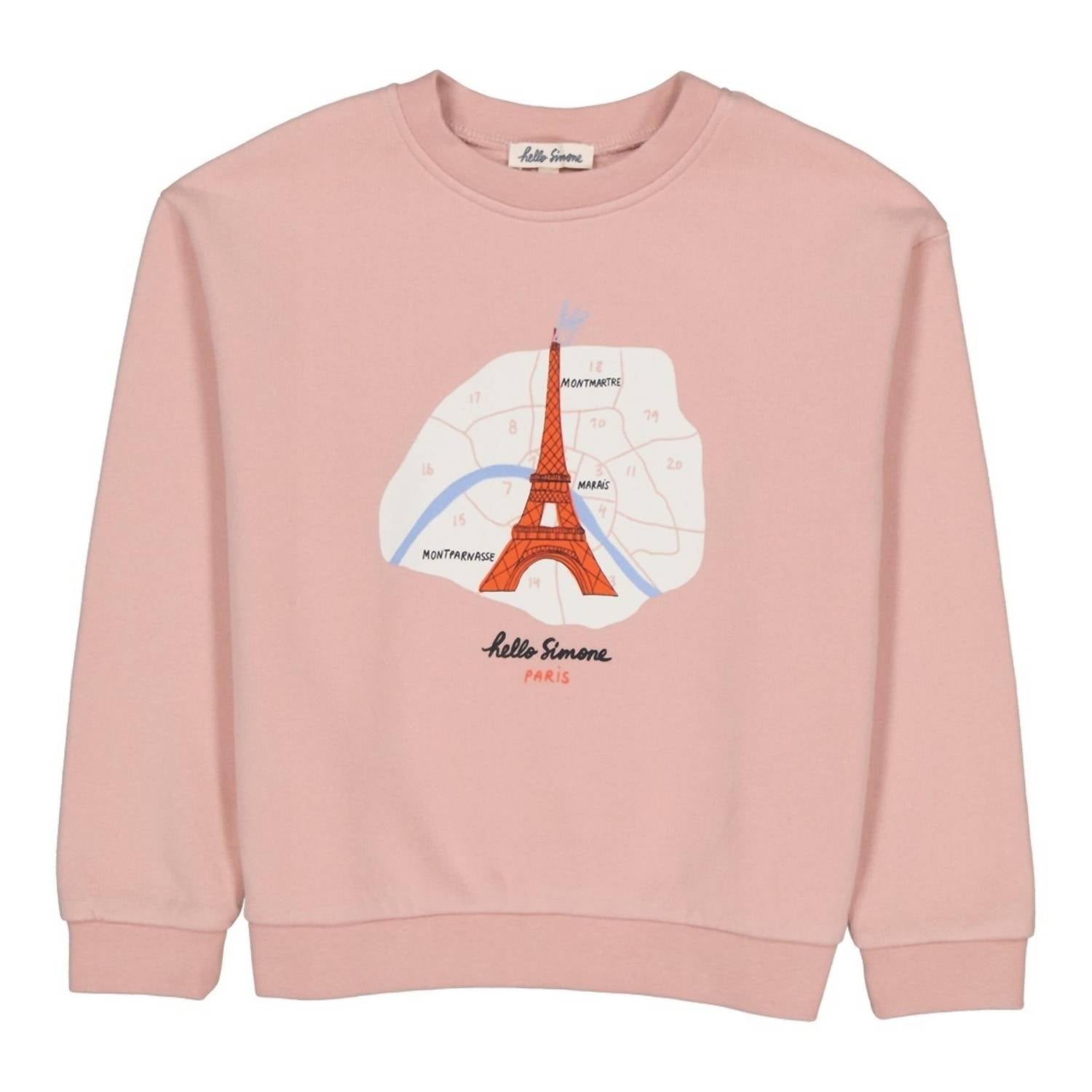 Introducing the Kid's Sweety Paris Sweatshirt by hello Simone, a warm and cozy essential in a delightful pink hue. Crafted from 100% organic cotton jersey, this sweatshirt features brushed fleece for enhanced insulation and an exclusive graphic drawing on the front. Made in Portugal with matching color rib trim for a cohesive finish. Machine washable at 30°, do not tumble dry.