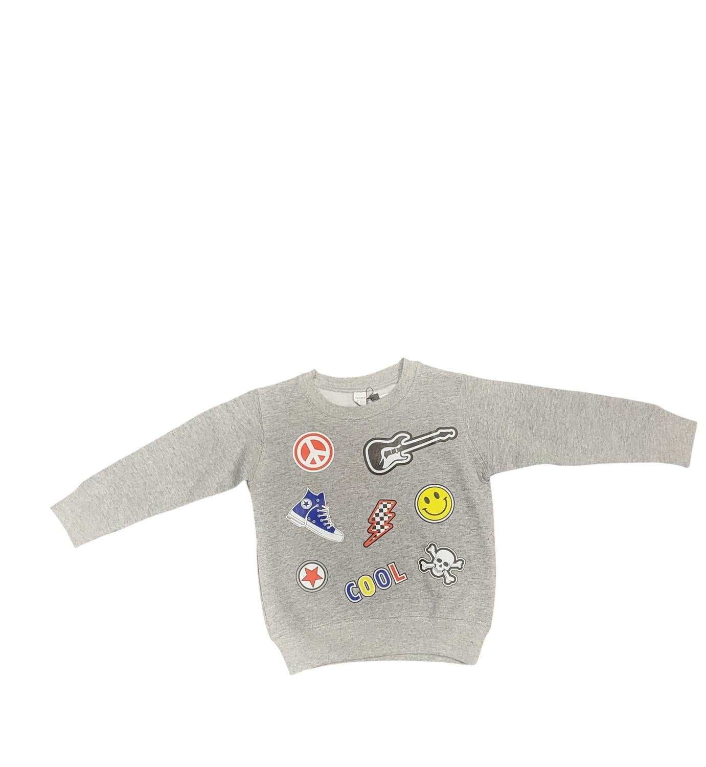 The Rock Candy Girl's Cool Patch Sweatshirt in grey offers a playful and vibrant design, perfect for those looking to express their personality. Featuring graphic patches such as a guitar, peace sign, and smiley face, this streetwear staple suits both kids and adults. Designed for women, this sweatshirt is ideal for vacation wear during the spring season. Care instructions are not provided, offering flexibility in garment maintenance.