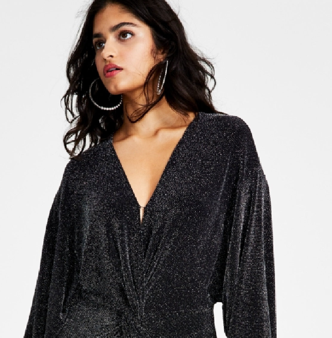 Shine on in Bar Iii's metallic-flecked| twist-front romper| This chic piece is styled with voluminous sleeves| too