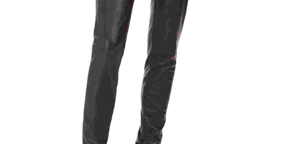 Approx. model height is 5'10" and she is wearing size small|Approx. inseam: 28-1/2"|Mid rise; slim fit through hips and thighs; skinny leg|Pull-on style|Hidden zipper at inside cuff; faux-leather finish|Polyurethane