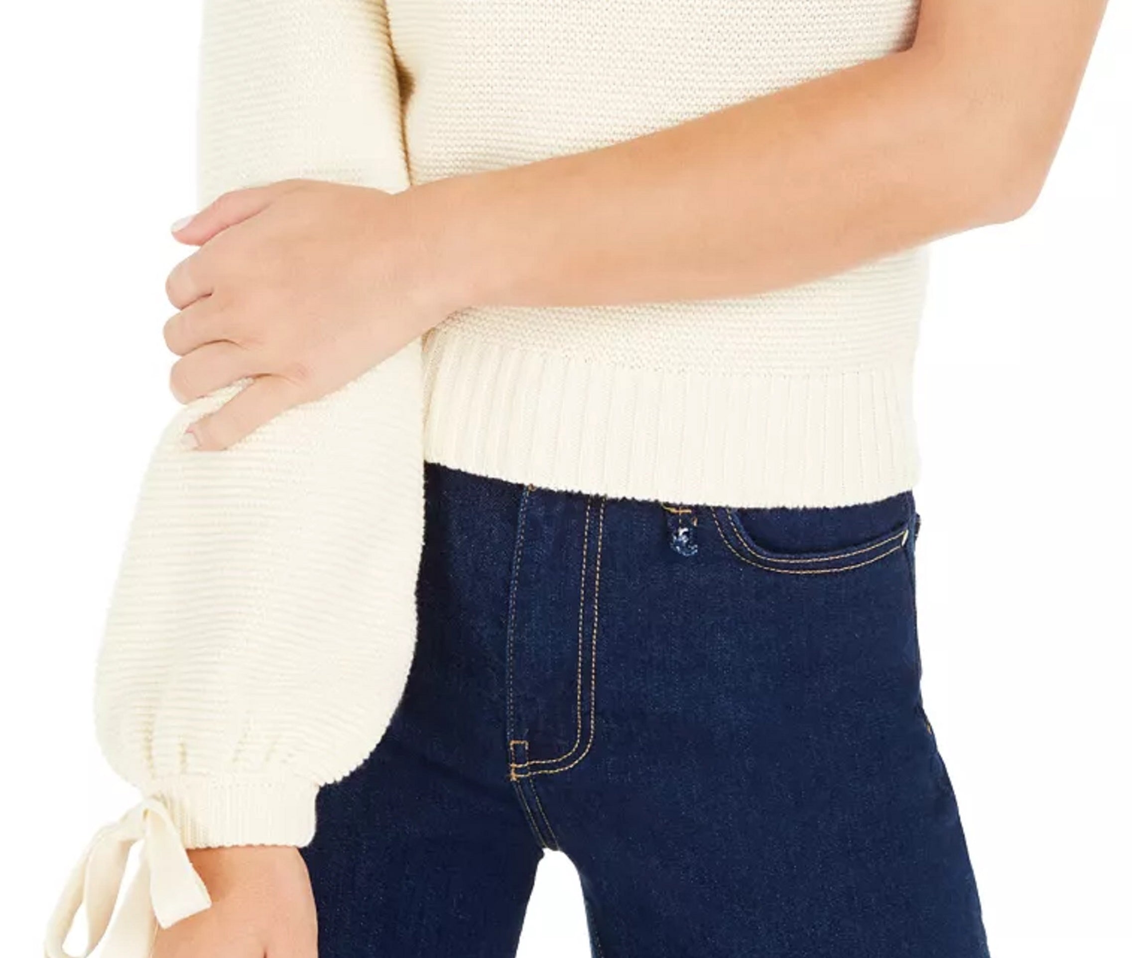 Relaxed fit; approx. 21-1/2 long|Asymmetrical neckline|One long blouson sleeve with bow at cuff|Cotton/acrylic