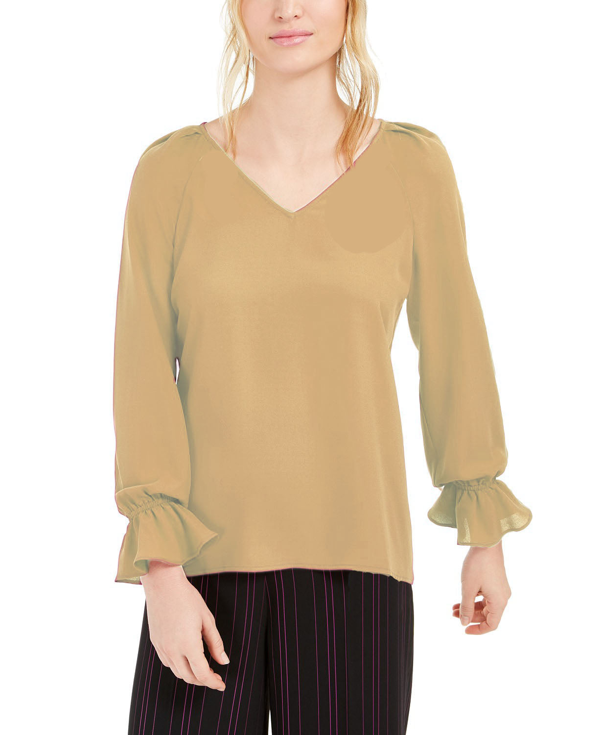 V-neck|Pleats at shoulders; elasticated at wrists|Long bell sleeves|Long bell sleeves