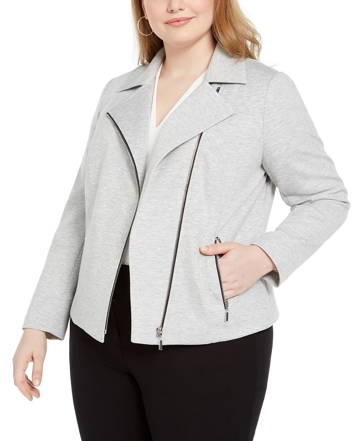 Approx. 23" long|Moto collar; asymmetrical zipper closure at front|Zipper pockets at hips|Unlined