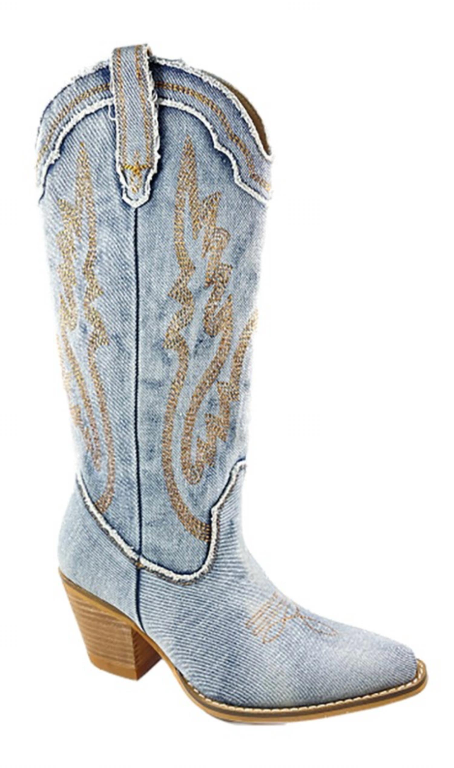 These over the knee boots are equal parts classic and cool. Step into style with the Women's Denim Calf Western Boot by ARider Girl, crafted in a striking blue hue. These boots feature intricate western embroidery that adds a unique touch to your ensemble. Each pair showcases individual dyeing, resulting in varied colors and wash levels for a one-of-a-kind look. Elevate your wardrobe with these standout over-the-knee boots, perfect for any fashion-forward adult woman. Country of origin not specified.