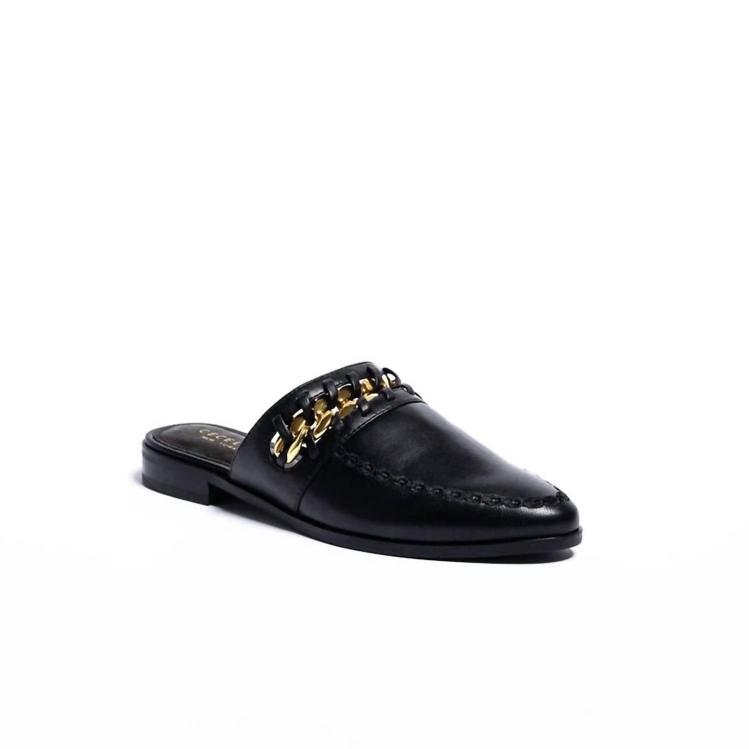 The Women's Dixon Mule by CECELIA NEW YORK in Black offers a sophisticated and stylish look with its striking chain embellishment. Crafted from leather with a synthetic sole, these slip-on mules provide a chic statement with their almond toe shape and flat 1/4" heel. Ideal for those seeking comfort and elegance, these mules fit true to size, making them a perfect addition to any wardrobe.