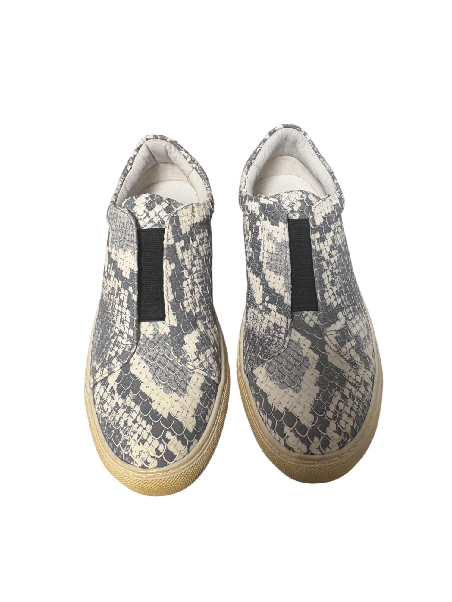 When fashion and function come together seamlessly. Step up your sneaker game with the Women's Nissa Slip-On Shoes by CHOCOLAT BLU, a chic and effortless choice for the fashion-forward. With a vintage-treated rubber sole and a comfortable approximately 1" platform, these sneakers offer a stylish lift. Composition: leather upper and leather lining with a cushioned footbed for superior comfort. They ensure easy slip-on convenience without sacrificing style, all wrapped in a distinctive grey embossed snake design.