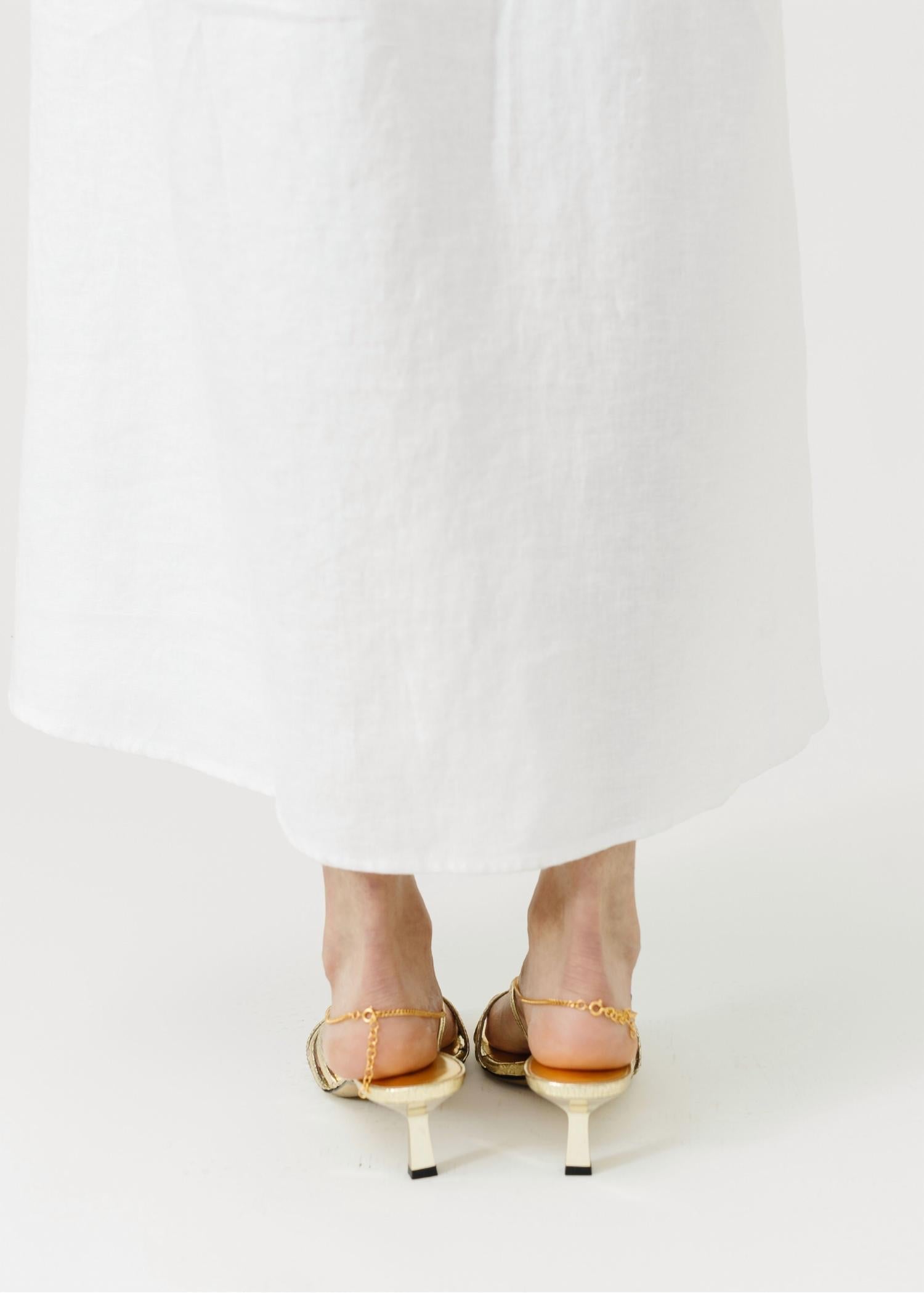 Elevate your style with the GOLDEN GOOSE Women's Nico Kitten Heel Sandal, a perfect blend of boldness and femininity. Made in Italy, this stunning sandal features slim metallic gold straps with a luxurious gold ring and chain embellishment. Crafted from 100% cow leather with a laminated wrinkled leather upper, it offers both elegance and durability. Perfect for spring dinner parties or Thanksgiving gatherings, the low open-toe kitten heel completes any look with maximalist flair.