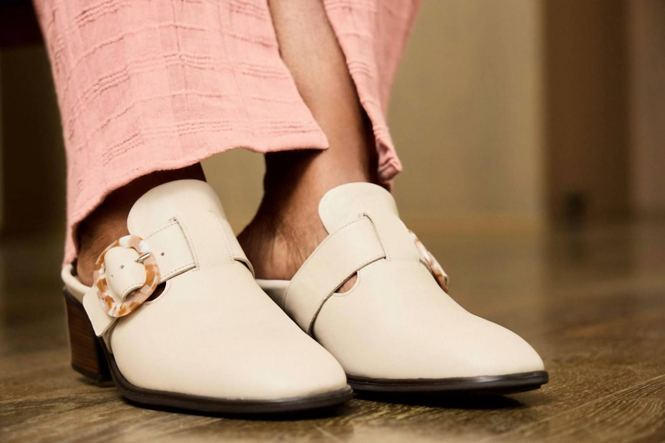 Crafted from premium leather, this mule boasts a comfortable 1.8" block heel and a stylish faux buckle accent. Its orthotic-friendly, removable footbed, wrapped in pampering suede, is designed to conform to your foot's unique shape over time. Enjoy the perfect fit with its medium width and true-to-size guidance.