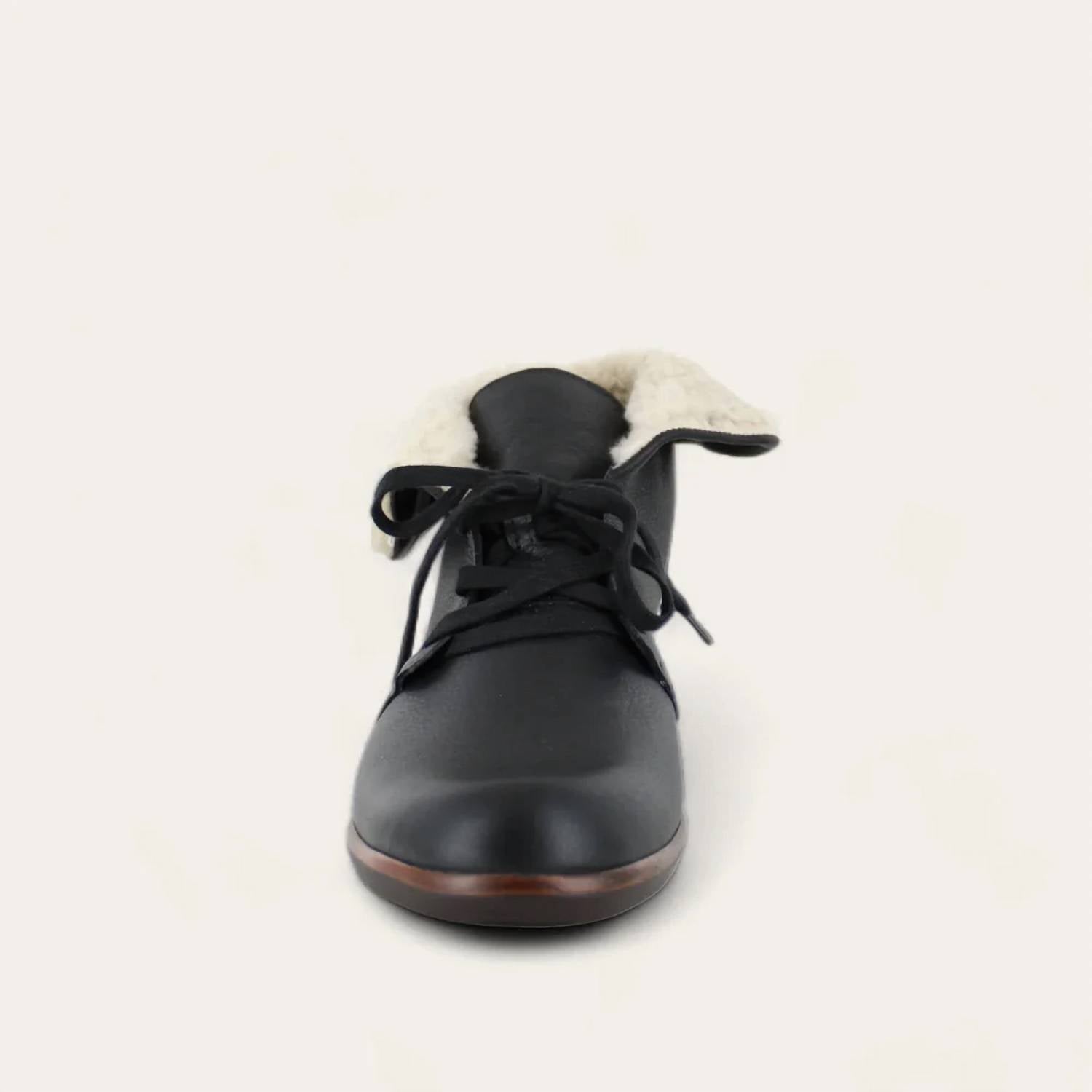 Say hello to the perfect, most versatile boot. The ankle height makes this style easily transition from day to night. Wear them with your favorite skinny jeans and tee for a more laid back look, or pair them with your favorite mini dress and jacket for a night out on the town. Step into comfort and style. Crafted in sleek soft black leather and featuring a cozy faux shearling cuff. Boast a practical lace-up closure and a low 1.5" block heel. Combined with NAOT's removable, anatomic cork and latex footbed, ensuring all-day comfort. Lightweight polyurethane sole includes a metal shank for added durability and slip resistance. True to size, with a recommendation for half sizes to size up.