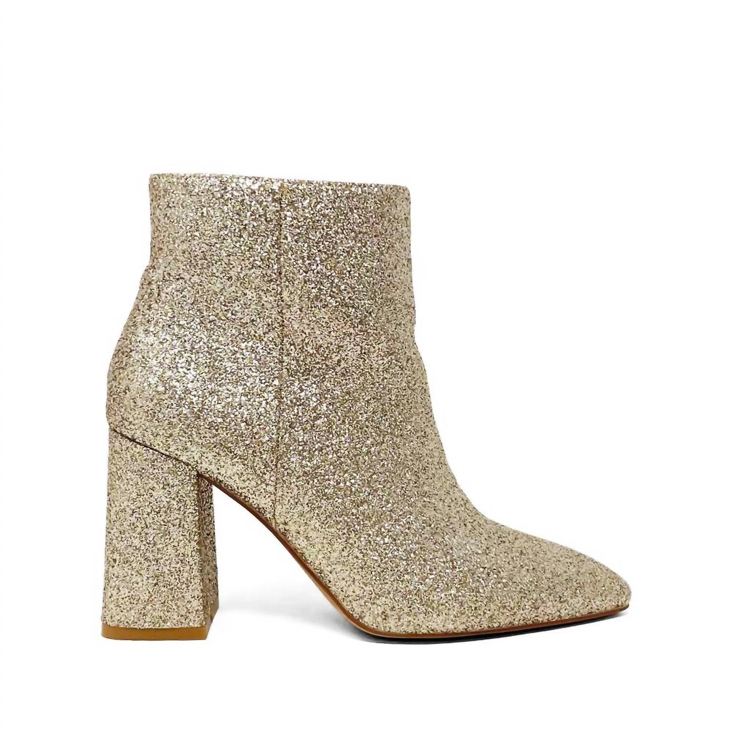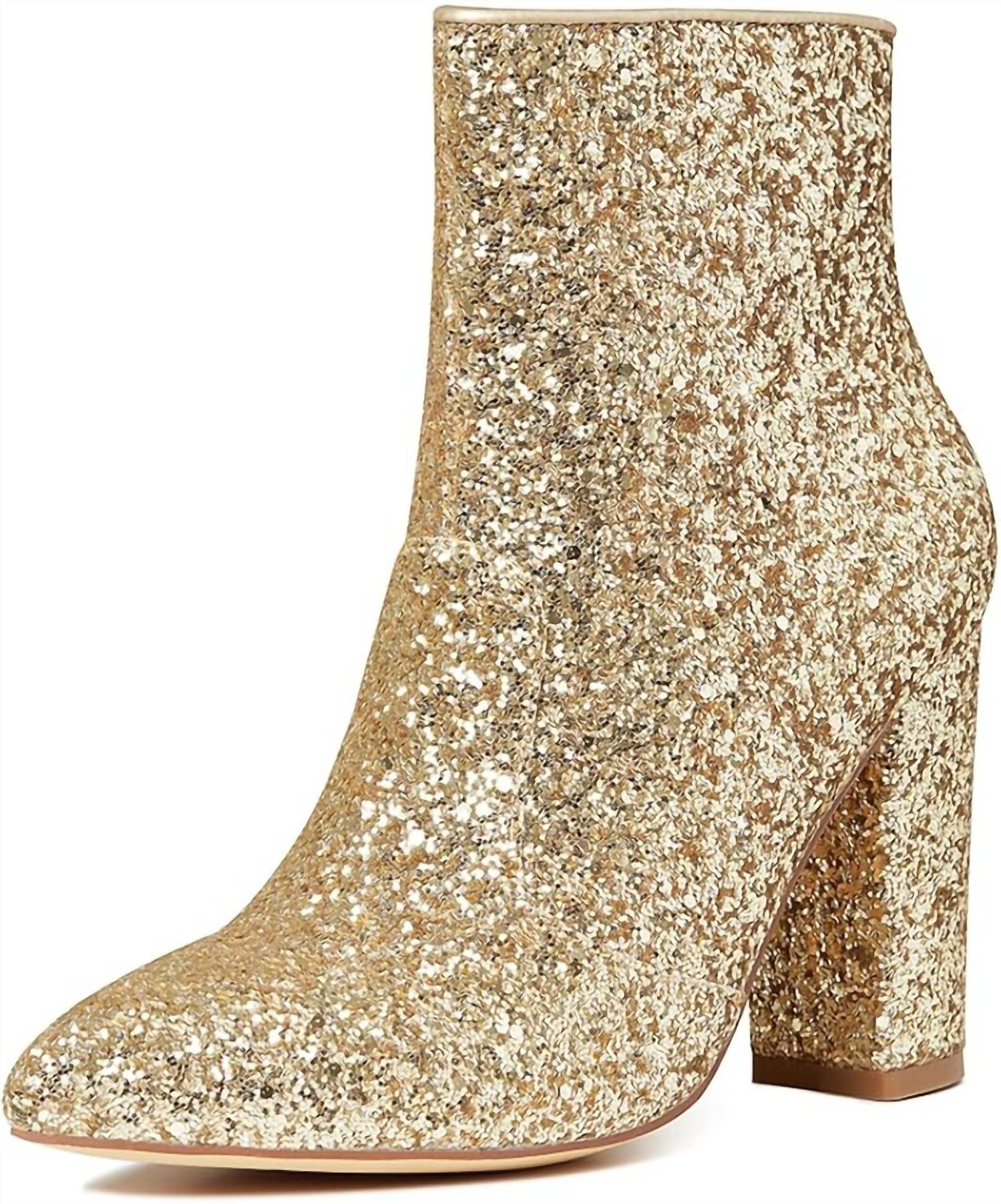 Upgrade your shoe game with these classic heeled boots, designed to merge sophistication and style. Comfortable enough for long days or a night out on the town. Elevate your look with the Women's Veronica Heeled Boot by SHU SHOP, a stylish choice for any occasion. Crafted from premium leather, this ankle boot boasts a glamorous gold glitter finish and a pointed toe for a sleek silhouette. Fitting true to size, it features a comfortable block heel in a mid-height range of 2 1/4" to 3", making it perfect for both workwear and holiday gatherings. Enjoy pairing it effortlessly with anything from cropped jeans to midi skirts for a chic, understated look.